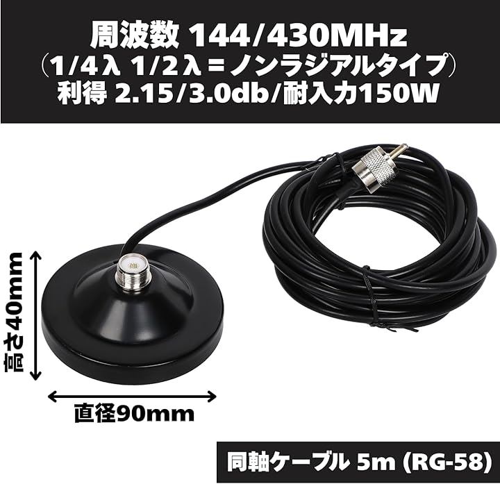 M型接栓 144/430MHz モービルアンテナ マグネット基台 同軸ケーブル 3点セット