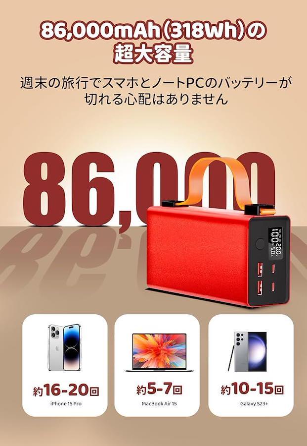 「驚異の大容量 (86000mAh/318.2Wh) で、災害時に大活躍」この製品は災害時のスマホやノート PC などの充電に備えておくには良い品物です。