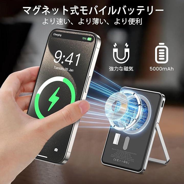 マグネット式モバイルバッテリーにはスタンドが内蔵されており、縦向きでも横向きでも、FaceTime、ビデオ鑑賞、ハンズフリーブラウジングに最適な強力で安定したスタンドになります。