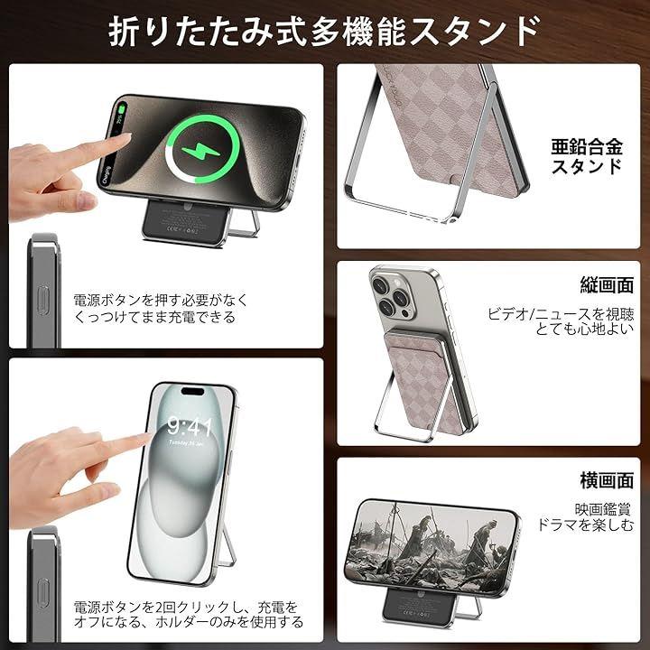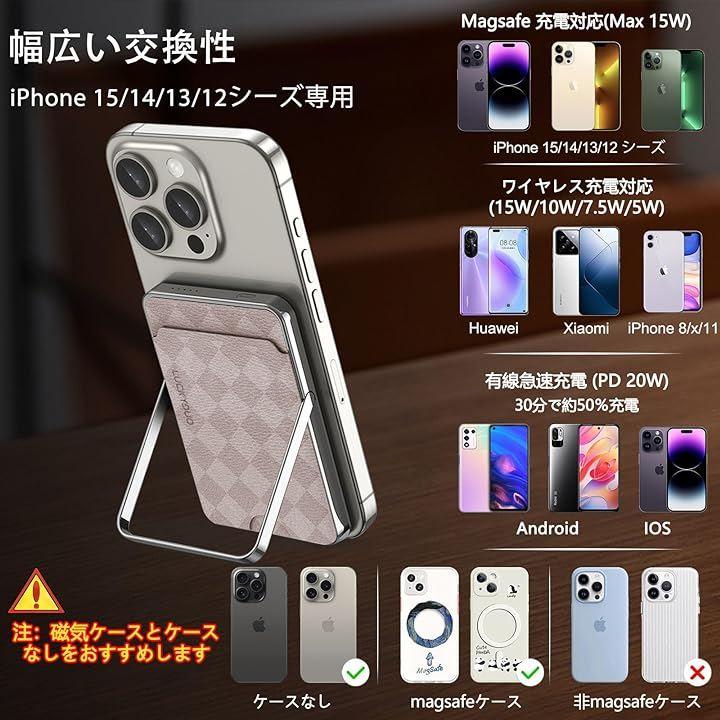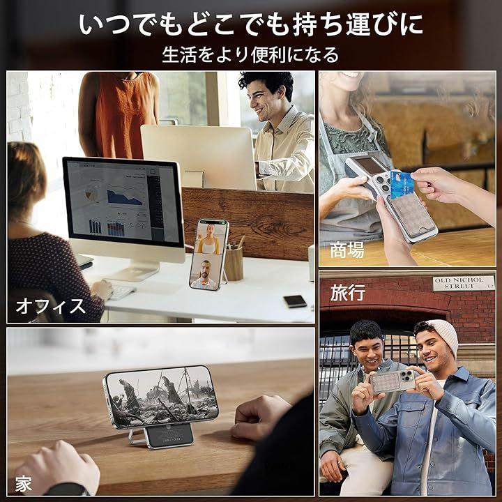 「強力な磁気で瞬時にパワーアップ」内蔵の強力な磁石により、磁気カードホルダーと充電器が所定の位置に保持され、携帯電話から滑り落ちるのを防ぎます。