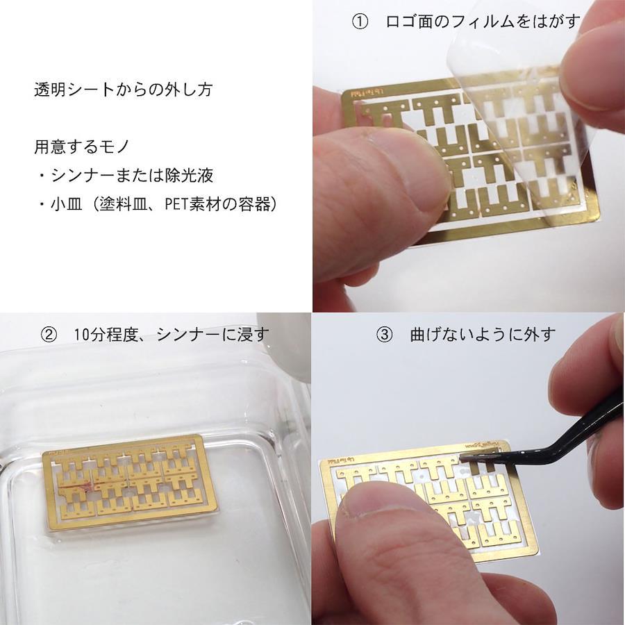 透明シートからの外し方1. メーカーロゴが入ってる表側の保護フィルムをゆっくりはがします。2. パーツ全体が入る小皿を用意し、シンナー(塗料の薄め液)、またはマニュキュアの除光液に数分間、浸します。3. 透明シートの糊が溶けたら、パーツを取り外します。パーツが曲がらないように、飛び散らないようにご注意ください。4. 取り外したパーツを新しいシンナーに再度、数分間つけると残っていた糊がきれいに除去できます。