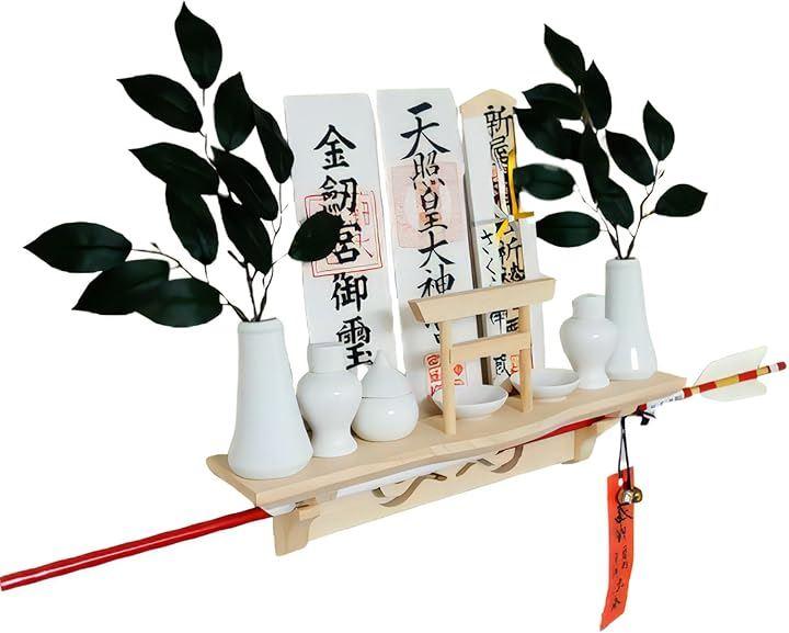 「*御札・神具一式・破魔矢は別売で付属はございません」鳥居の差込み穴は鳥居を抜けづらくする為に少しづらして設計されておりますので、鳥居を差し込む時は鳥居の足部分を軽く握り、穴に合わせ、はめ込むようにして取付けて下さい。