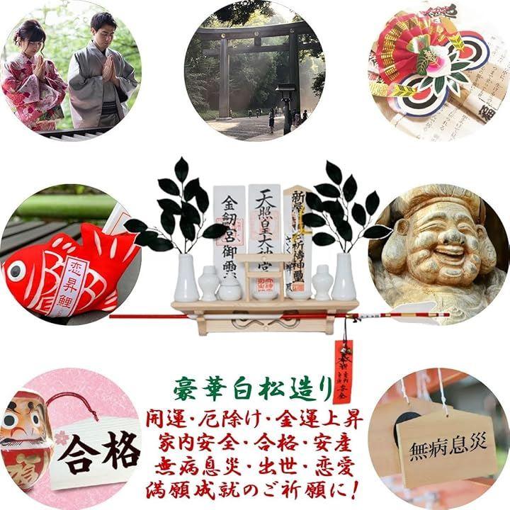「用途」壁掛け 神棚 破魔矢立て お札立て 御神札飾り 御守り飾り 木札差し 御守り入れ 棚板「 開運 招福運 初宮詣 七五三詣 合格祈願 厄祓 安産祈願 病気平癒 必勝祈願 交通安全 新車祓 家内安全 業務安全 商売繁盛 旅行安全 結婚式 その他、諸祈願 」