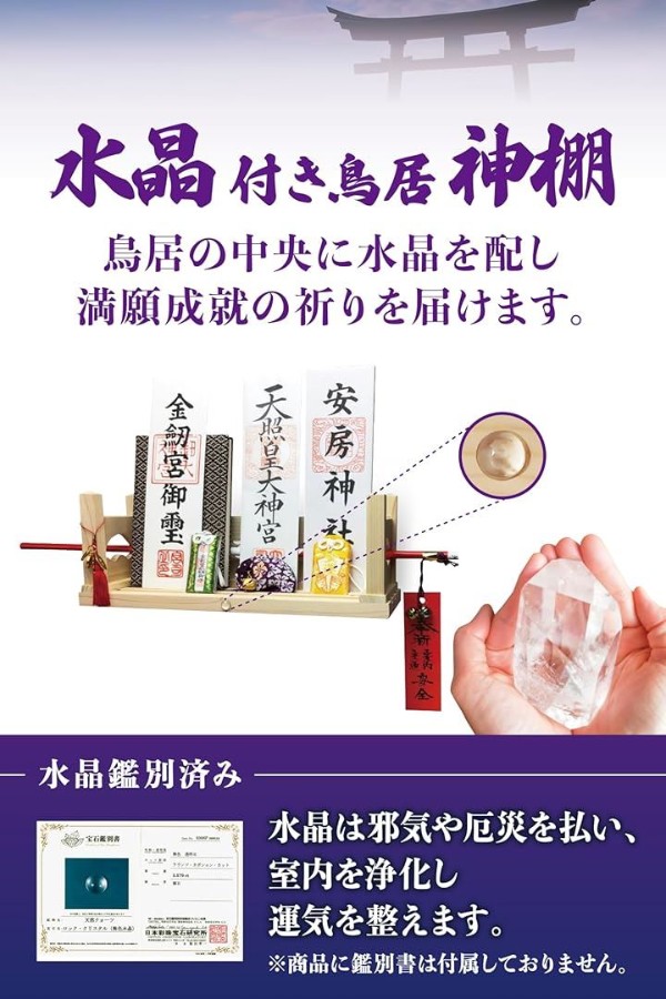 底板中央には神聖なる浄化の石「水晶」を配した本格神棚で、底板部分に3本の溝があり、御札を縦横に数枚お祀りする事が出来きます。