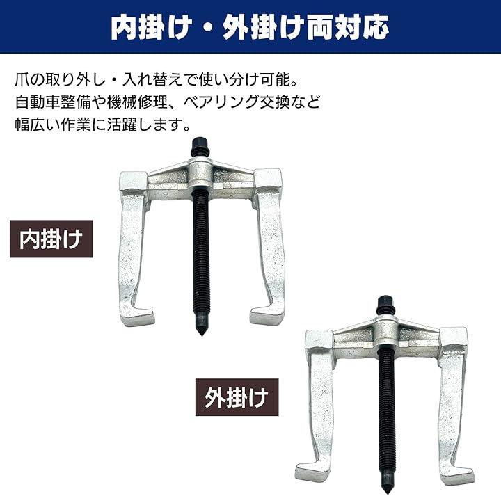 爪を取り外して入れ替えることで外掛け・内掛けの両方に対応可能で、自動車整備や機械修理、ベアリング交換など幅広い作業を効率よく行える実用性の高い仕様となっています。