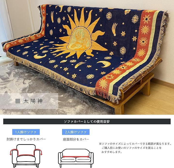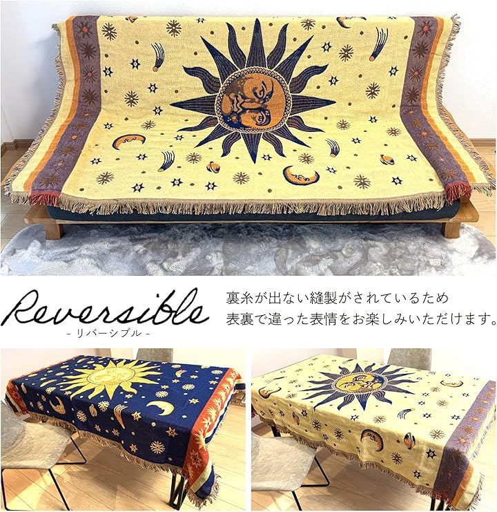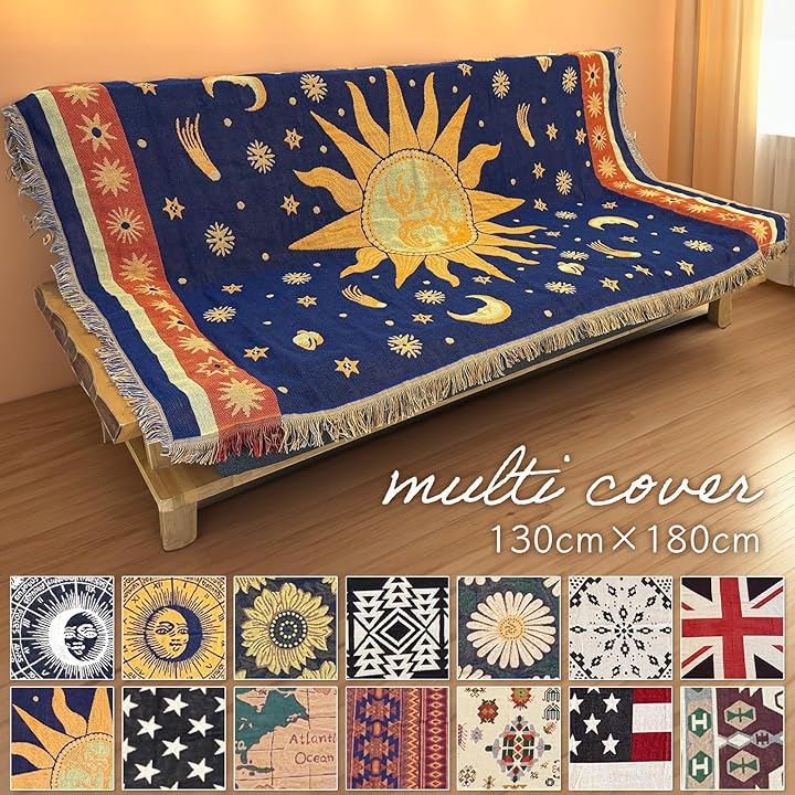 世界地図柄、太陽柄、星条旗、星座模様など豊富なデザインを揃えており、ソファーカバー、ベッドカバー、こたつ掛けカバーとして使うだけで、お部屋の雰囲気を手軽に変えられます。
