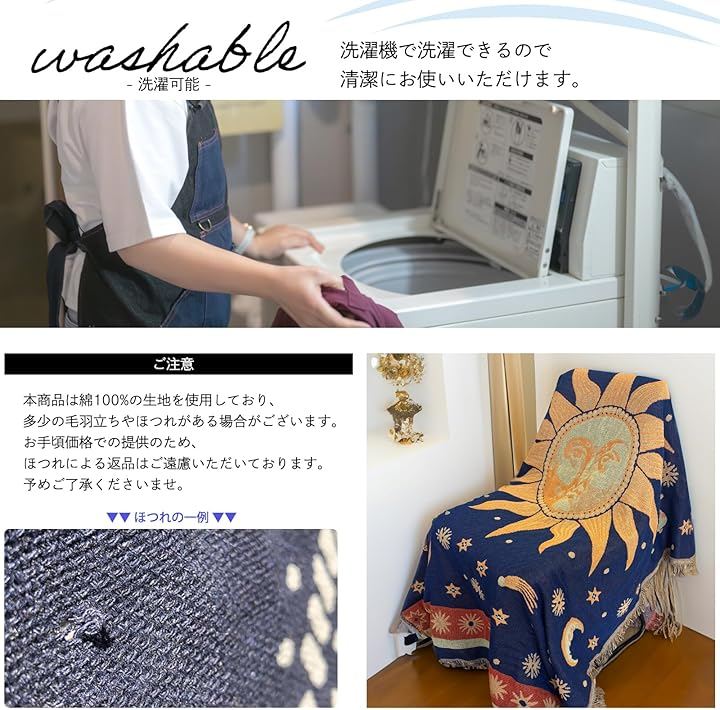 「素材」綿100%、木綿糸、耐久性あり 「デザイン」太陽神、アメリカ国旗、星座など多種類 「サイズ」130cmx180cm 「厚さ」3mm 「重量」1.5kg