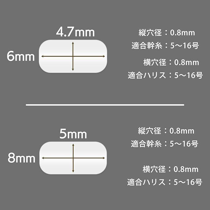 2つのサイズ(4.7mm x 6mmと5.0mm x 8mm)があり、さまざまな釣りに対応しています。