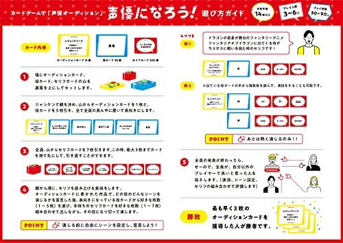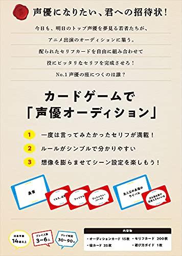 カードゲームで「声優オーディション」 一度は言ってみたかったセリフが満載! ルールがシンプルで分かりやすい 想像を膨らませてシーン設定を楽しもう! 動画配信のネタとしても最適!