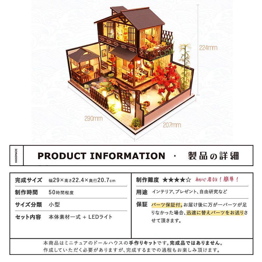 庭に池まである大豪邸の日本家屋のドールハウス。庭の造形のひとつひとつまでリアル。そのまま生活できそうな現代風。憧れのインテリアが詰まった、1/24ミニチュアサイズ。 【完成サイズ】 本体:幅29×高さ22.4×奥行20.7cm 【サイズ分類】 大型 【制作時間】 50時間以上 【制作難易度】 ★★★★☆(難しい) 【セット内容】 素材一式&LEDライト 【保証】:パーツ保証付。お届け後に万が一パーツが足りなかった場合、迅速に替えパーツをお送りさせて頂きます。 制作時間は50時間以上!完成した時の達成感が格別!じっくりどっぷりドールハウスの世界感に没頭した時間を過ごせます♪完成品は、ついつい何度も眺めてしまうことになります…♪日常で見慣れたビーズや、金具などがみるみるうちに小さな家具に生まれ変わる様子は感激! 箱・説明書は中国語で書かれていますが、図解されていますので理解できます。初心者の方でも作って頂けるよう、説明書はフルカラーで全行程が丁寧に解説されています。 夏休みの自由研究、バレンタイン、誕生日、クリスマス、ハロウィン、父の日、母の日などのプレゼントにもおすすめ。