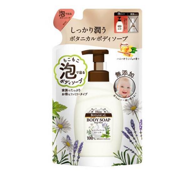 製品の特徴●ネイチャーラボ「ダイアンボタニカル 泡ボディソープ ディープモイスト」は、100%植物由来の洗浄成分で洗う泡タイプの弱酸性ボタニカルボディソープ。●ホイップシアバター(*1)で敏感肌もリッチに潤います。●家族でたっぷり使えるファミリータイプ。●敏感肌の方やお子さまにもお使い頂けます。●ハニーオランジュの香り。●シアバター(*2):肌を乾燥から守り潤いをキープ。●オーガニックオイル:肌をやさしくケア。●オーガニックシュガー(*3):なめらかで、やわらかいハリのある肌へ。●6つの無添加:サルフェートフリー(ラウレス硫酸Naなど)・パラベンフリー・合成色素フリー・鉱物油フリー・石油系界面活性剤フリー・エタノールフリー