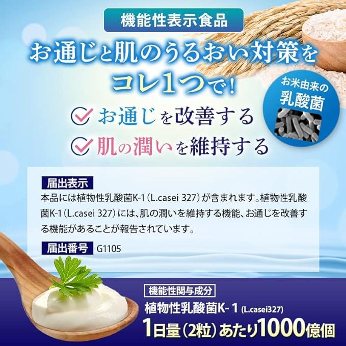 【機能性表示食品】お通じと肌のうるおいをこれ1つで対策!乳酸菌で便通の改善と肌の潤いを維持することができる機能性表示食品です。便秘でお悩みの方におススメのサプリです。 届出表示:本品には植物性乳酸菌K-1(L.casei 327)が含まれます。植物性乳酸菌K-1(L.casei 327)には、肌の潤いを維持する機能、お通じを改善する機能があることが報告されています。【届出番号】G1105 【6種のサポート成分を厳選配合】「フラクトオリゴ糖」「アガベイヌリン」「難消化性デキストリン」「ヒアルロン酸」「フィッシュコラーゲンペプチド」「ハトムギエキス」 【製品のこだわり】香料、保存料、着色料、光沢剤は一切使用していません。【製造のこだわり】徹底的に管理された日本国内の健食GMP認定工場で製造。品質試験に合格した商品のみ皆様にお届けしております。 【お召し上がり方】1日2粒を目安に、水又は白湯と一緒に噛まずにお召し上がりください。(1袋60粒入り 30日分)