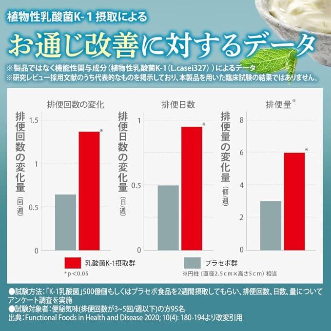 この商品について 【機能性表示食品】お通じと肌のうるおいをこれ1つで対策!乳酸菌で便通の改善と肌の潤いを維持することができる機能性表示食品です。便秘でお悩みの方におススメのサプリです。 届出表示:本品には植物性乳酸菌K-1(L.casei 327)が含まれます。植物性乳酸菌K-1(L.casei 327)には、肌の潤いを維持する機能、お通じを改善する機能があることが報告されています。【届出番号】G1105 【6種のサポート成分を厳選配合】「フラクトオリゴ糖」「アガベイヌリン」「難消化性デキストリン」「ヒアルロン酸」「フィッシュコラーゲンペプチド」「ハトムギエキス」 【製品のこだわり】香料、保存料、着色料、光沢剤は一切使用していません。【製造のこだわり】徹底的に管理された日本国内の健食GMP認定工場で製造。品質試験に合格した商品のみ皆様にお届けしております。 【お召し上がり方】1日2粒を目安に、水又は白湯と一緒に噛まずにお召し上がりください。(1袋60粒入り 30日分)