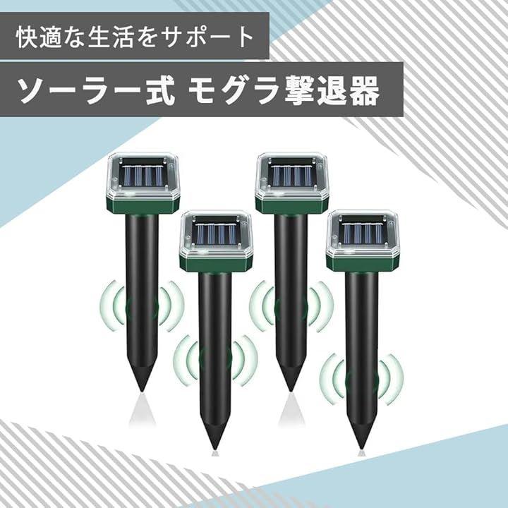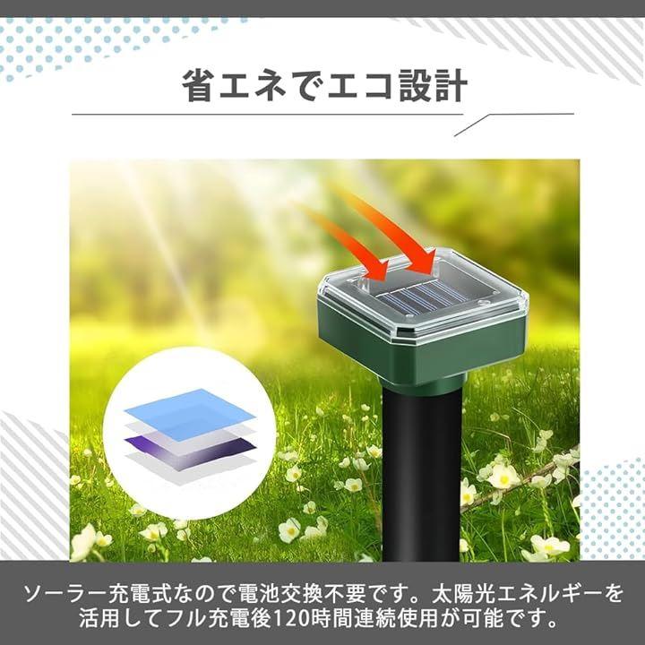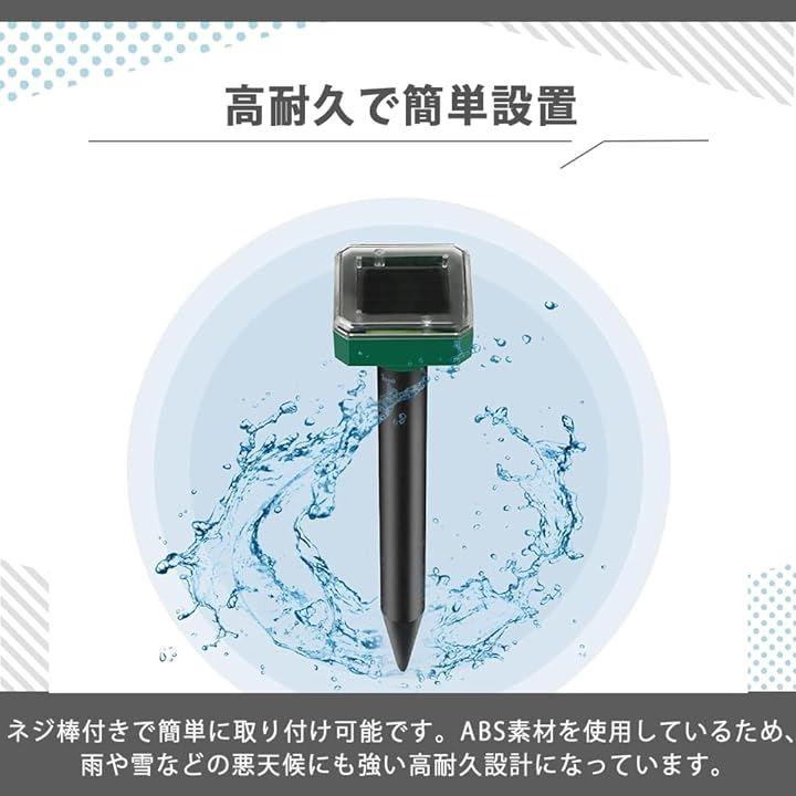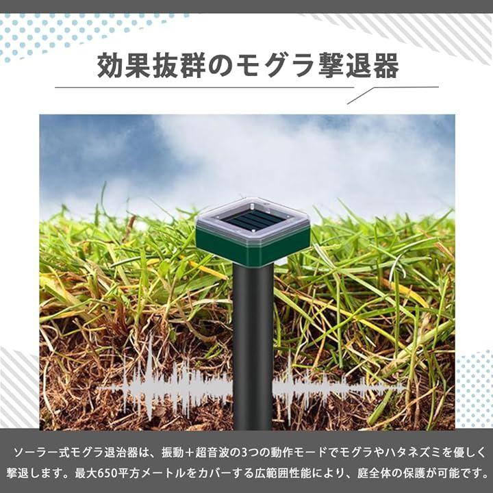 「効果抜群のモグラ撃退器」ソーラー式モグラ退治器は、振動+超音波の3つの動作モードでモグラやハタネズミ、ヘビを優しく撃退します。