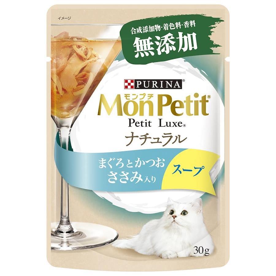 着色料・香料無添加、合成添加物も不使用のナチュラルパウチ。あなたのネコちゃんに具だくさんスープでナチュラルな美味しさを。