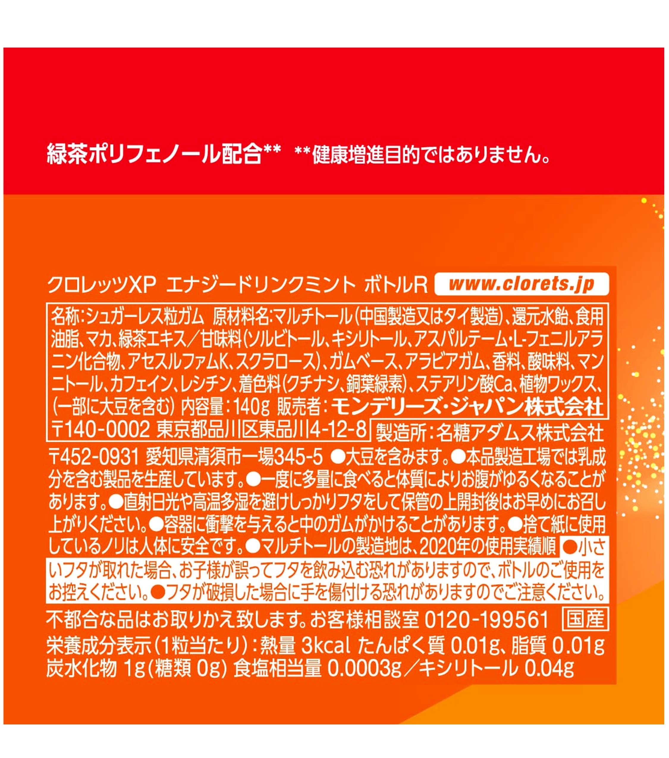 マルチトール(中国製造またはタイ製造)、還元水飴、食用油脂、マカ、緑茶エキス/甘味料(ソルビトール、キシリトール、アスパルテーム・L‐フェニルアラニン化合物、アセスルファムK、スクラロース)、ガムベース、アラビアガム、香料、酸味料、マンニトール、カフェイン、レシチン、着色料(クチナシ、銅葉緑素)、ステアリン酸Ca、植物ワックス、(一部に大豆を含む)