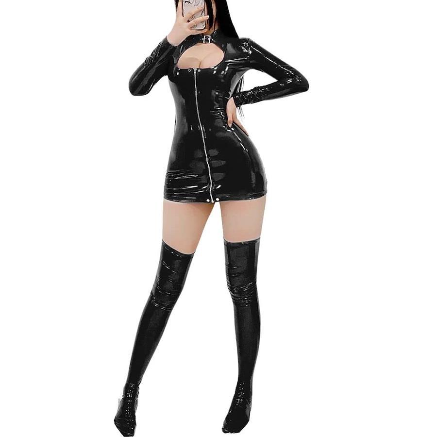 [MONEON] セクシー 光沢 ボンテージ エナメル ミニスカ ワンピース ストッキング付き 2点セット sm 女王様 ボディコン ドレス コスプレ コスチューム ブラック 黒 大人用 カワイイ 可愛い プレゼント 衣装 服 女性用 人気 (M(S~M), ブラック)