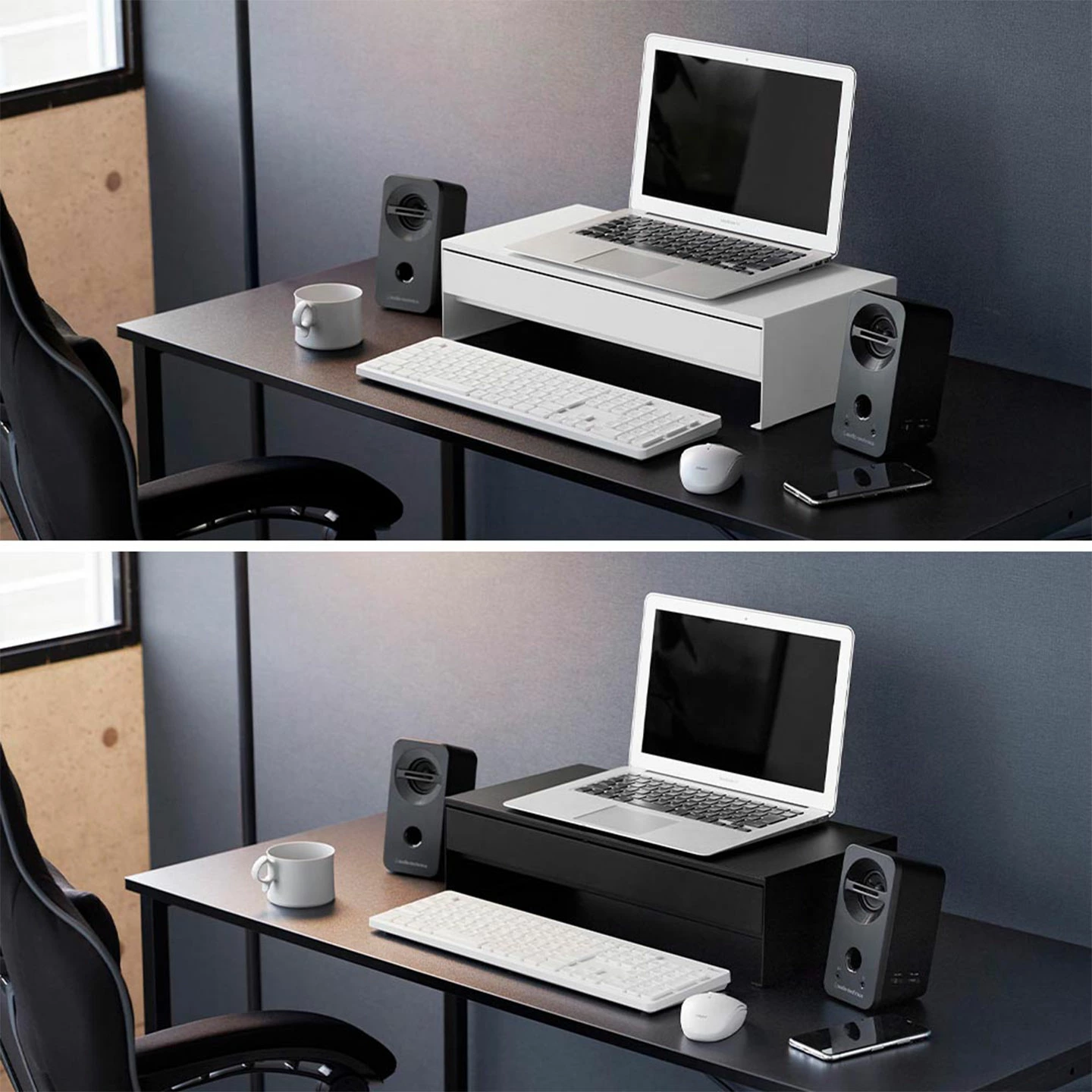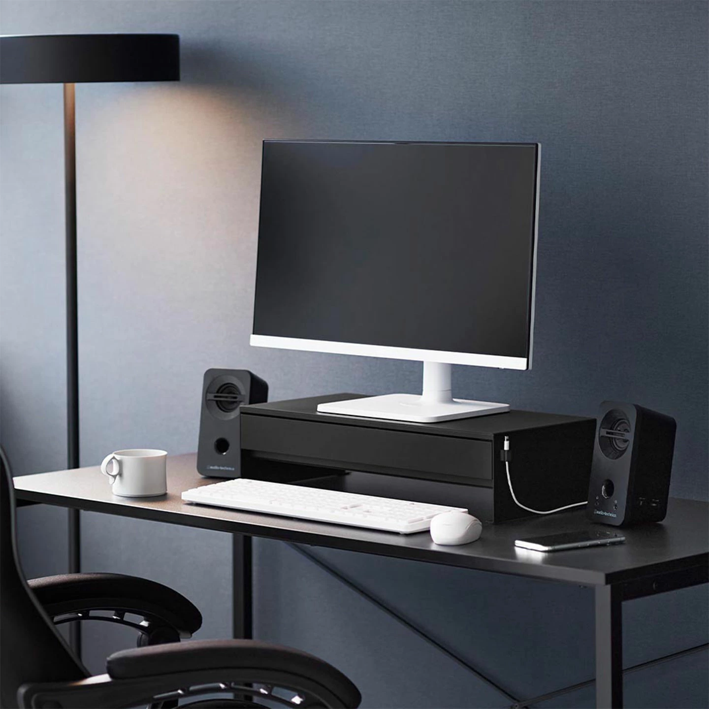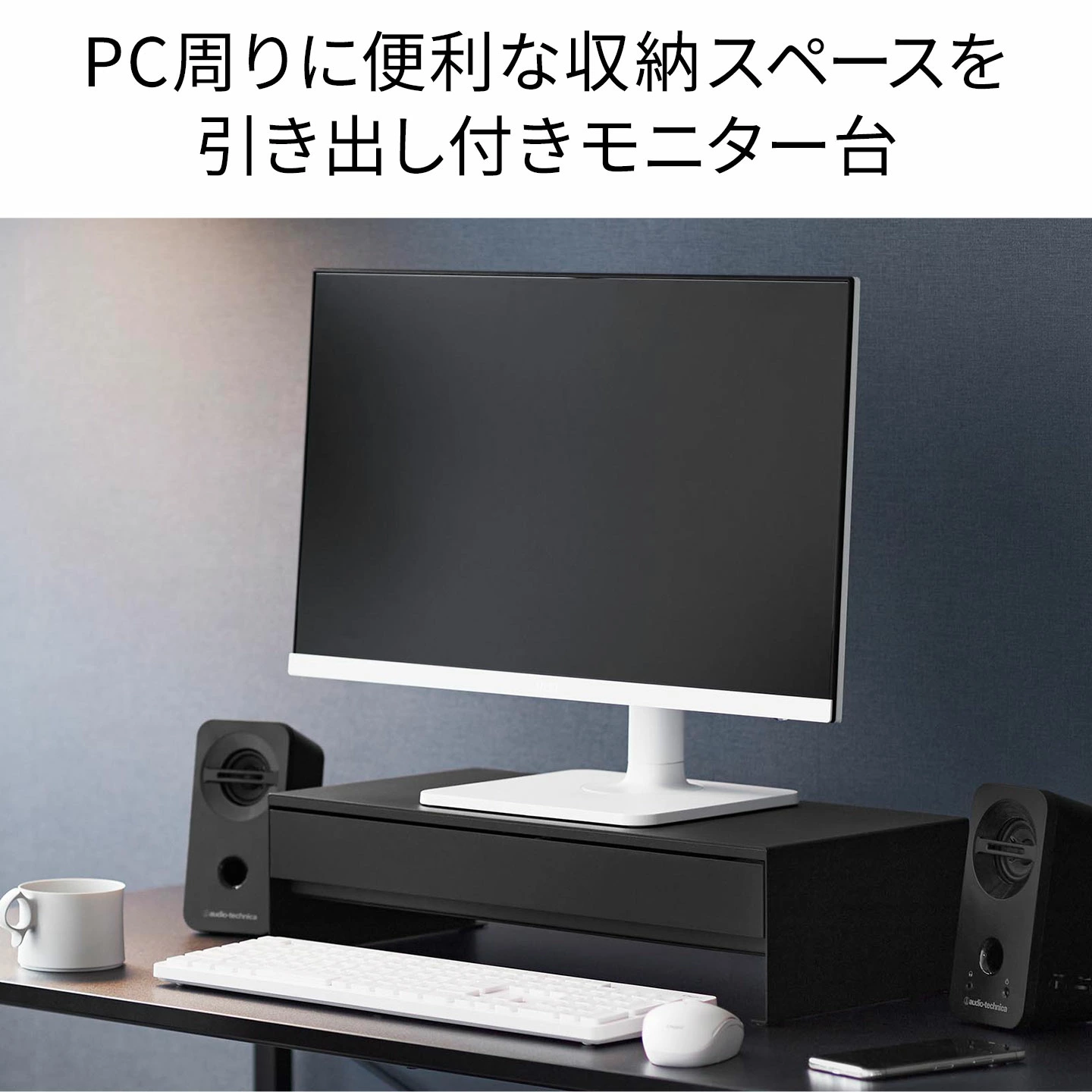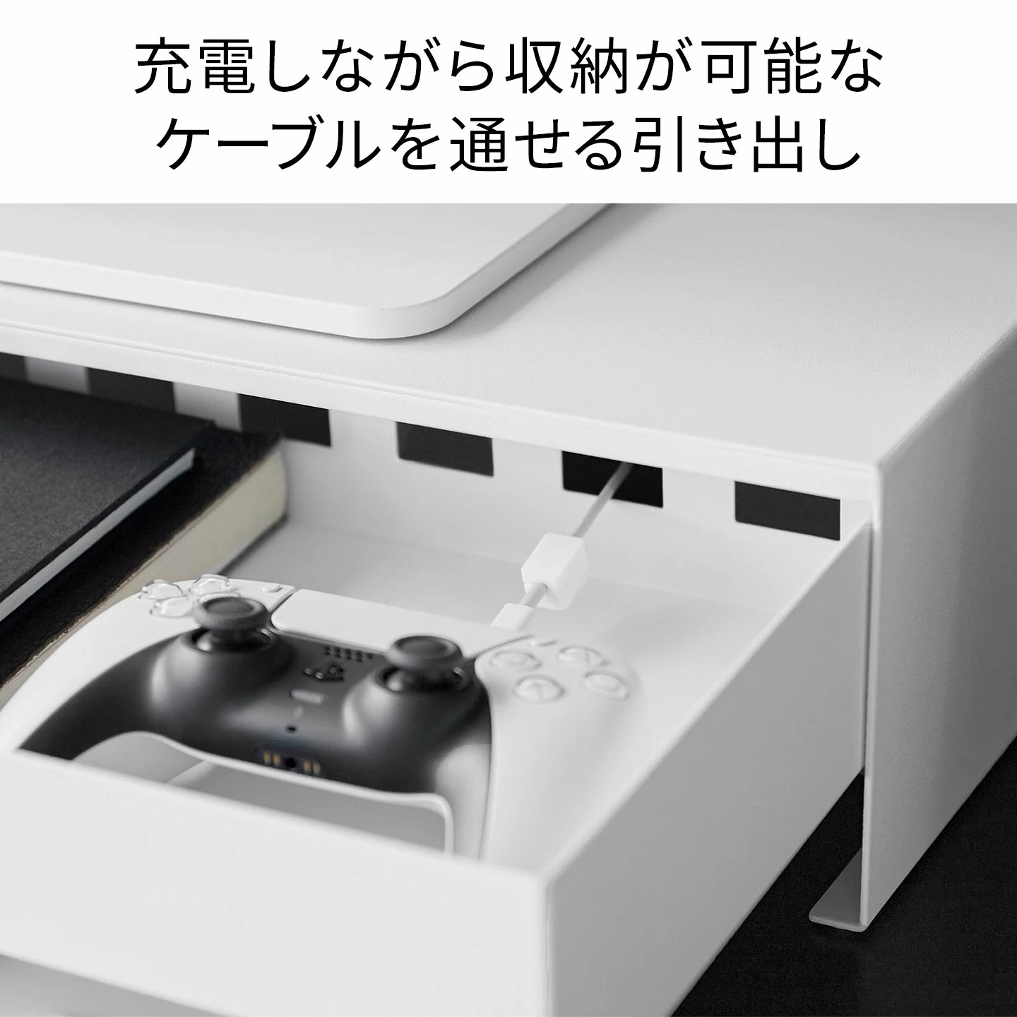 【ゲームコントローラーも入る引き出し付きモニター台】モニター下のデッドスペースを有効活用!ゲームコントローラーも入る広々設計の引き出し付きモニター台です。引き出し内には、可動式のマグネット付き仕切りが付いているので、整理がしやすく便利。引き出し奥には充電ケーブルを通せる穴が空いていて、収納しながらの充電も可能です。引き出し下スペースにはキーボードが収納可能。マグネット内蔵のケーブルホルダーが2個付属しており、ケーブル類もスッキリ整理できます。