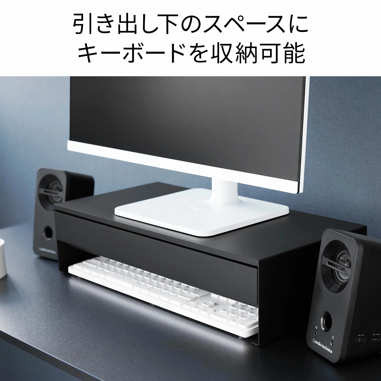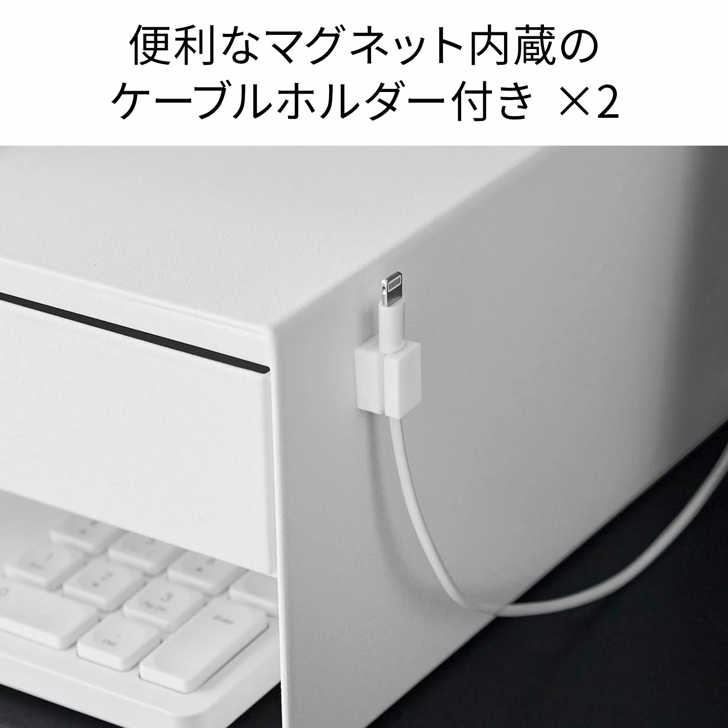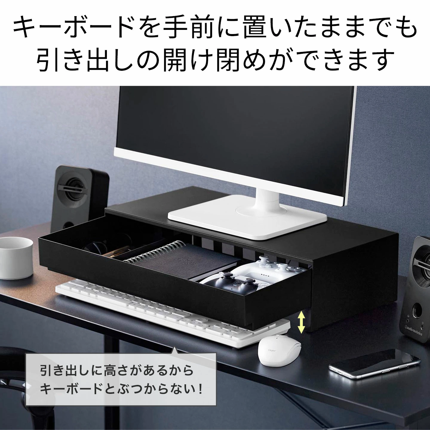 【ゲームコントローラーも入る引き出し付きモニター台】モニター下のデッドスペースを有効活用!ゲームコントローラーも入る広々設計の引き出し付きモニター台です。引き出し内には、可動式のマグネット付き仕切りが付いているので、整理がしやすく便利。引き出し奥には充電ケーブルを通せる穴が空いていて、収納しながらの充電も可能です。引き出し下スペースにはキーボードが収納可能。マグネット内蔵のケーブルホルダーが2個付属しており、ケーブル類もスッキリ整理できます。