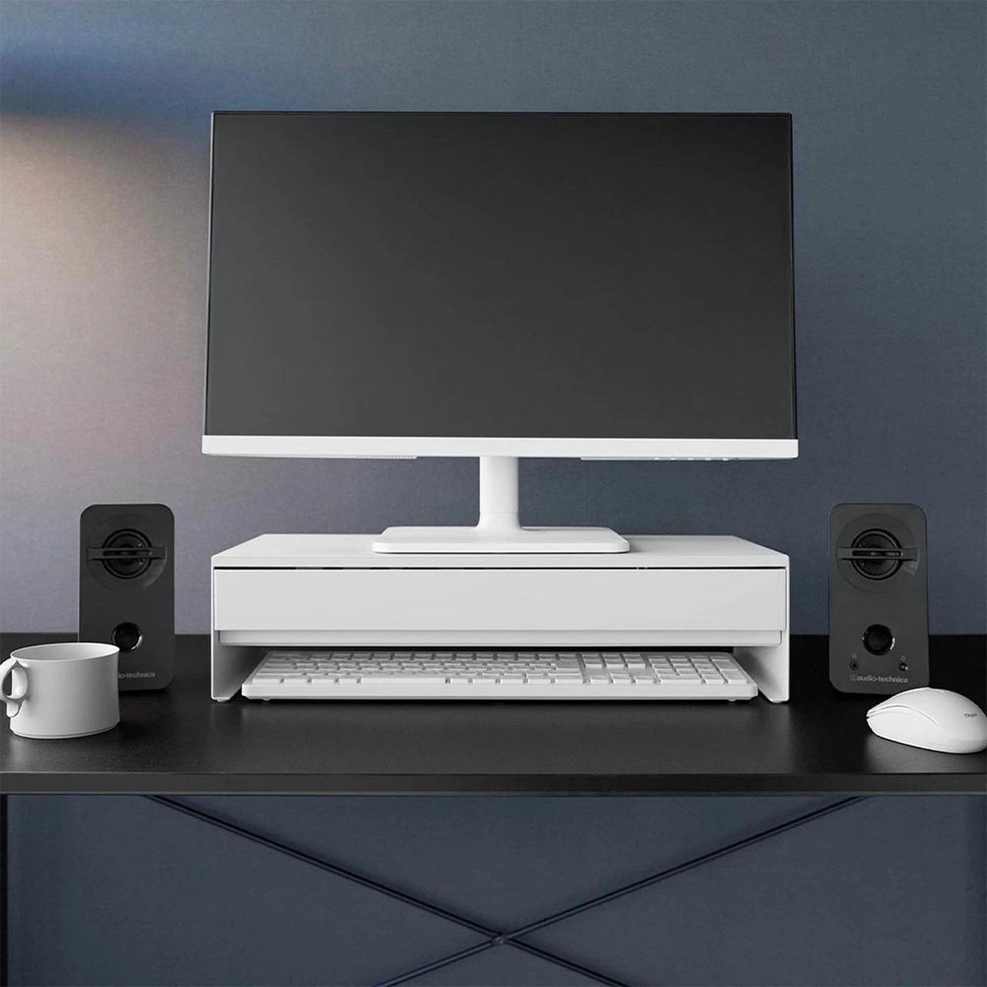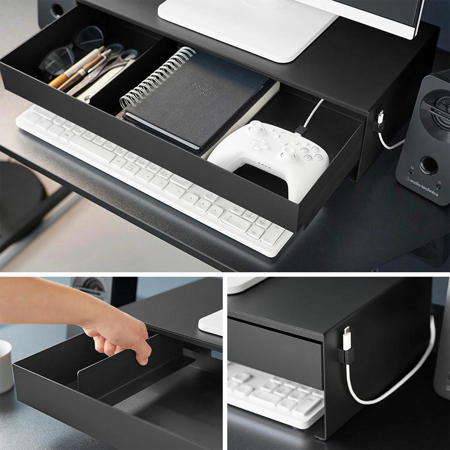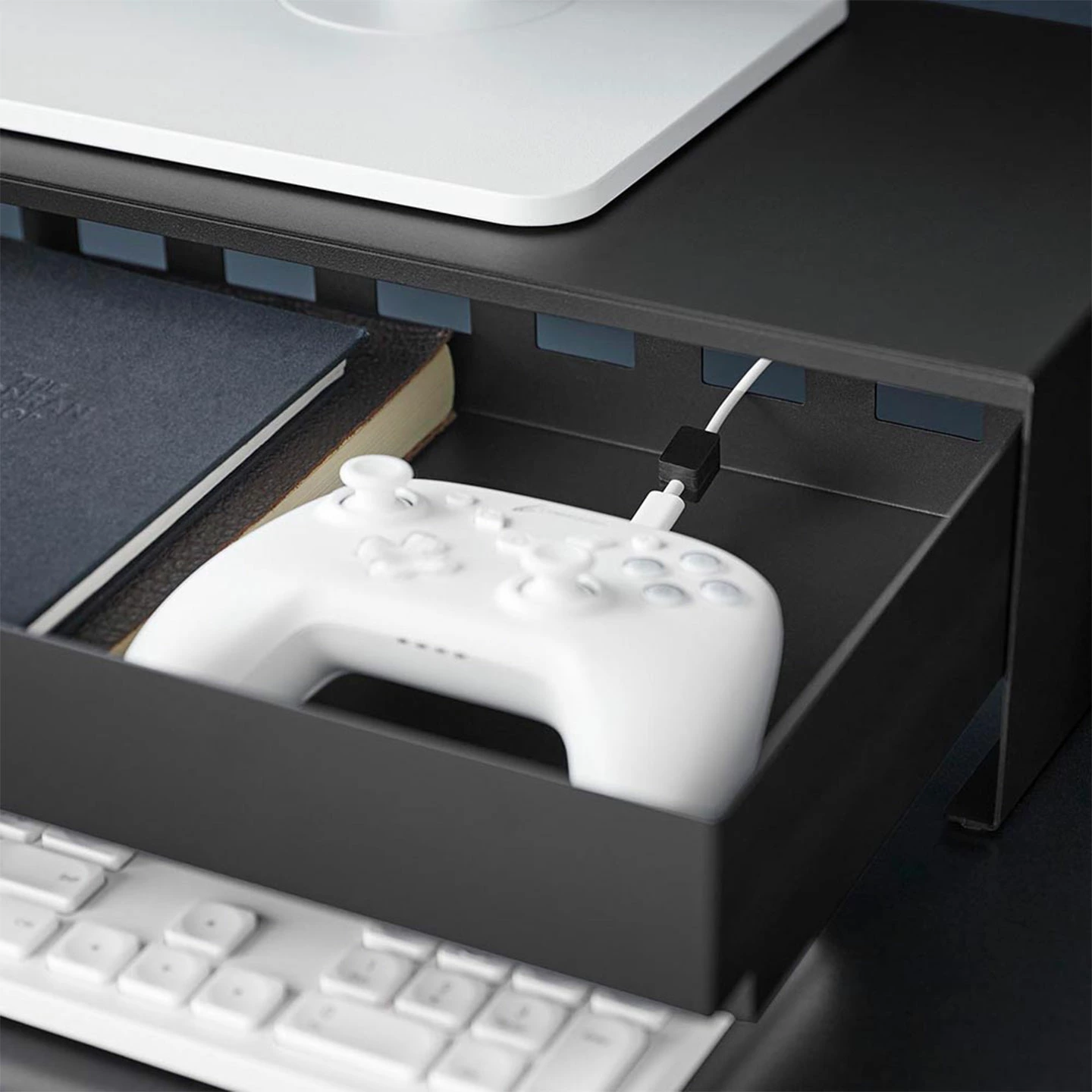 【ゲームコントローラーも入る引き出し付きモニター台】モニター下のデッドスペースを有効活用!ゲームコントローラーも入る広々設計の引き出し付きモニター台です。引き出し内には、可動式のマグネット付き仕切りが付いているので、整理がしやすく便利。引き出し奥には充電ケーブルを通せる穴が空いていて、収納しながらの充電も可能です。引き出し下スペースにはキーボードが収納可能。マグネット内蔵のケーブルホルダーが2個付属しており、ケーブル類もスッキリ整理できます。