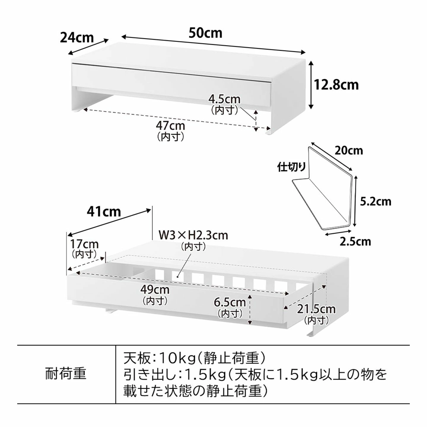 ■サイズ約W50×D24~41×H12.8cm[ 内寸 ]天板:W50×D24cm引き出し:W49×D21.5×H6.5cm(有効内寸)(開口部最大:D17cm)ケーブル通し口1か所あたり:W3×H2.3cm引き出し下:W47×D24×H4.5cm