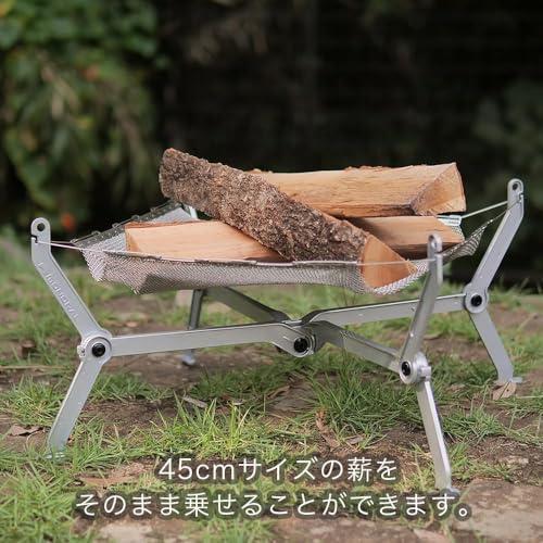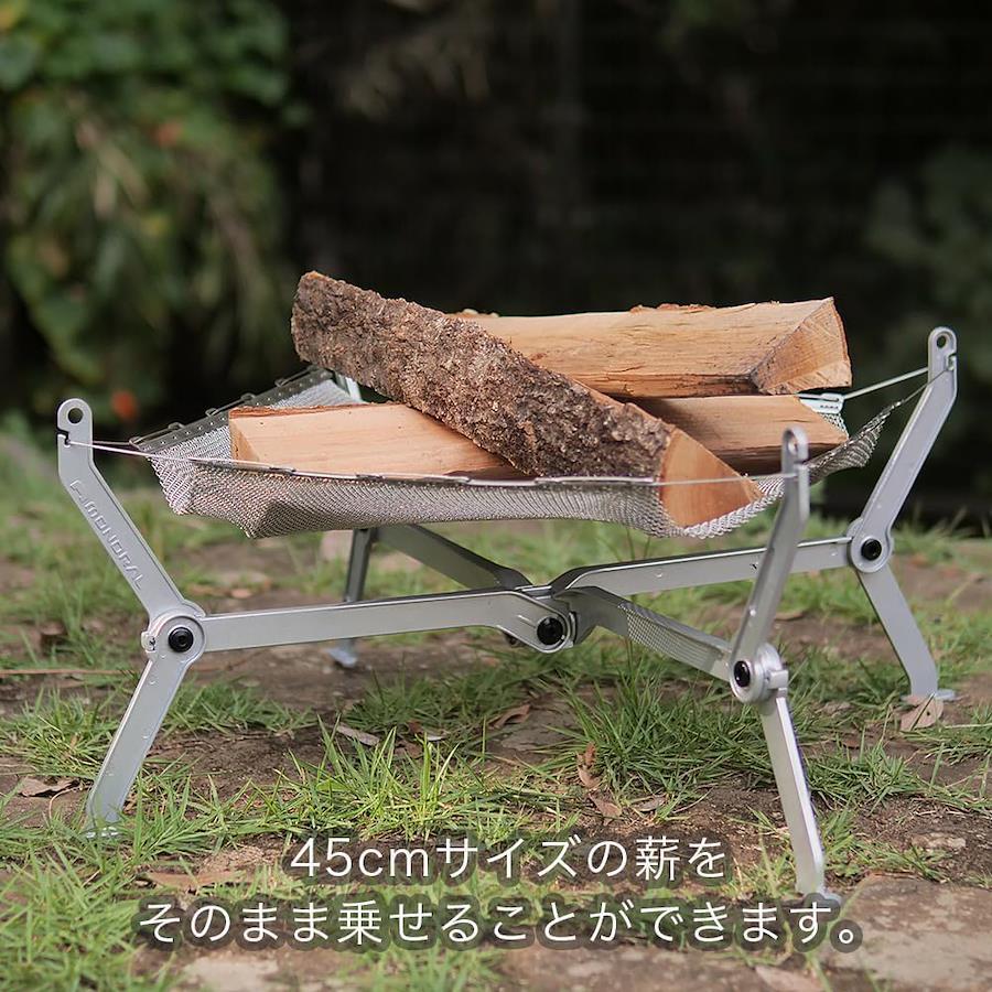 焚き火台 (折り畳み式 / コンパクトタイプ )材質:(本体)アルミ合金 / (火床) ステンレススチール火床サイズ:47cm×47cm (正方形)重量:1,400g(本体+ステンレスメッシュ)耐荷重:10kg収納時サイズ:7x9x35cm付属品:携行用の専用スタッフバッグ別売オプション:五徳アタッチメントLL/スパッタハンモックLL45cm薪をそのまま使用可能