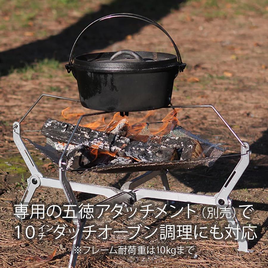 アルミ合金製フレームは一体構造の可変式。アームを開閉するだけで使いやすい35cm 角の正方形火床を簡単に収納設営できます。フィールドでいくつものパーツを組み合わせるような面倒がありません。 収納は長さ26cmの棒状のため、バックパックにも容易に入ります。重量も約1kg と先代ワイヤフレー ムと変わりません。軽い、強い、便利を極めた焚き火台です。標準でステンレスリングメッシュ火床を付属。耐熱クロスより長期の使用が可能になりました。リングメッシュは一般的な金網より線径が太いため耐久性に優れ、潰して小さくすることがます。MONORALの特許であるワイヤイン構造により、火床はバスタブ上になり薪が落ちにくい上、鍋などを直接置くことができ、抜群の使い勝手を誇ります。ワイヤレームソリッドのフレームは、ユーザーによる分解が可能。アーム交換によりサイズを拡大できます。調理を便利にする五徳アタッチメント、フレームに取付できる小型テーブルなど、アタッチメントを開発中です(2023年発売予定)。ワイヤフレームソリッドを中心に様々なキャンプスタイルに発展できることを目指しています。ワイヤフレームに対して多かったのが、ダッチオーブンを載せられますか?という問い合わせでした。今までMONORALではダッチオーブンを使用しないキャンプを想定していました。ワイヤフレームソリッドではより幅広いキャンプスタイルに対応すべく、本体重量を増やすことなく耐荷重を10kg に大幅アップ。10インチダッチオーブンの積載を 可能にしました。