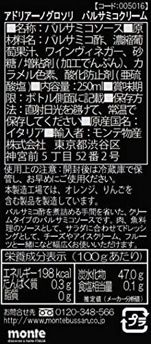 内容量:250mlカロリー:198Kcal原材料:バルサミコ酢、濃縮葡萄果汁、ワインヴィネガー、葡萄果汁、砂糖、増粘剤(加工でんぷん)、カラメル色素、酸化防止剤(亜硫酸塩)商品サイズ(幅×奥行×高さ):50×50×200【重要】メーカーによる商品リニューアルに伴いパッケージ(内容量も含む)変更が行われた場合、新パッケージでお届け致します事ご了承願います。