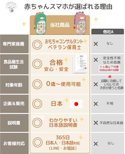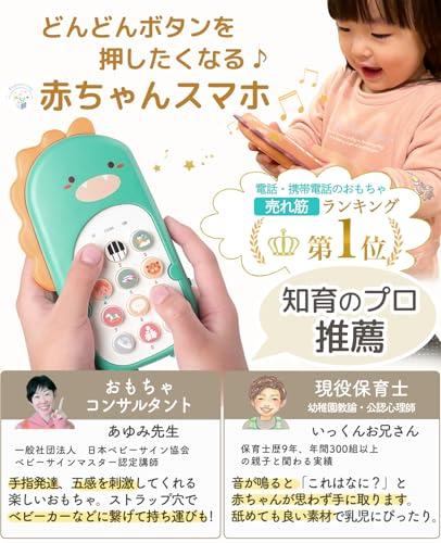 【おもちゃコンサルタント&人気保育士も推薦!】赤ちゃんスマホはボタンを押せば音が流れるシンプルな操作方法で、「自分の力でできた!」という感覚と、もっとやってみたい!という自立心をのばすことができます。はじめてテクノロジーにふれる赤ちゃんにピッタリのおもちゃです。英語の有名曲と数字の読み上げ、キャッチーな効果音を計64種類収録。親子で一緒に発音したり歌うことで、楽しく遊びながら絆を深められます。 【赤ちゃんが夢中になるキュートな恐竜デザイン】可愛い恐竜のデザインで、赤ちゃんがずっと持っていたくなる魅力的なおもちゃです。約130グラムと軽量で、角のない安全設計なので、落としてケガの心配がありません。お出かけにも持ち運びやすいサイズです。 【便利な音量調節機能】2段階の音量調節とバイブレーションのオン・オフが簡単にできます。周囲の環境に合わせて遊べるので、場所を選びません。一定時間操作がないと自動で電源がオフになるため、電池の消耗を防ぎます 【安全・安心の品質】厚生労働省が定める6歳未満対象の玩具の安全性を証明する「食品衛生法試験」に合格済み。口に入れても安全なうえ、恐竜のたてがみ部分は柔らかいシリコン製で、赤ちゃんがたくさん噛んでもお口を痛めません 【好奇心を育てる知育玩具】外出が難しい赤ちゃんでも、天気や動物の鳴き声など多彩な音に触れることができます。物事への興味を広げ、好奇心を育みます。 【セット内容】赤ちゃんスマホ本体(商品サイズ:約縦14.5×横8.0×厚さ2.5cm 商品重量:約127g)、わかりやすい日本語説明書。 【プレゼントにも最適】楽しく遊びながら子どもの能力も育める知育玩具。男の子、女の子問わず人気のプレゼントです。出産祝い、誕生日、クリスマスなどのギフトに最適です