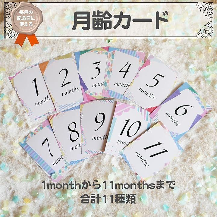 月齢カードが1month~11monthsまでの11種類、 成長に合わせて使用できる「できた」カードが6種類、 毎月以外の記念日カードが7種類と合計24種類使えます。