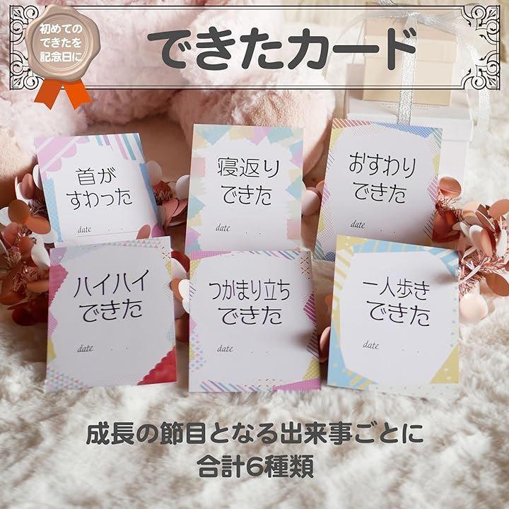 「首がすわった」「寝返り」「おすわり」「ハイハイ」「つかまり立ち」「ひとり歩き」、「できた」カードには日付を入れる欄があるので、後で写真を見た時にいつの出来事かすぐにわかります。