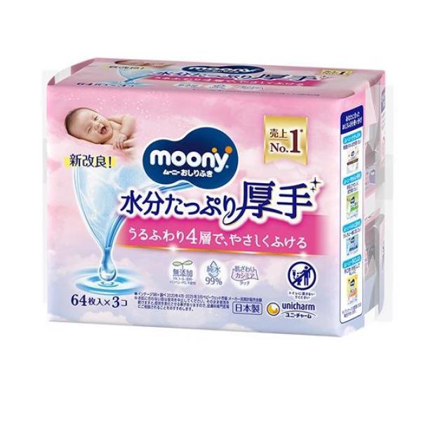 製品の特徴●moony ムーニー おしりふき 水分たっぷり厚手●お尻拭き●うるふわり4層で、やさしくふける。●中間層に、新・水分たっぷり層搭載で、水分量UP!うんちなじみ成分配合で、こびりつきうんちにもサッとなじんで、こすらずするんと拭いてあげられます。●4層の中に、しっかり層を搭載し、上下のシートを一体化させるから、伸びにくく、しっかりと拭いてあげることができます。●純水99%●ノンアルコール●香料無添加●パラベン無添加●PG(プロピレングリコール)無添加●手や体にも使えます。●トイレに流せません。●販売名:ムーニーおしりふきg●シートサイズ:約130mm×200mm
