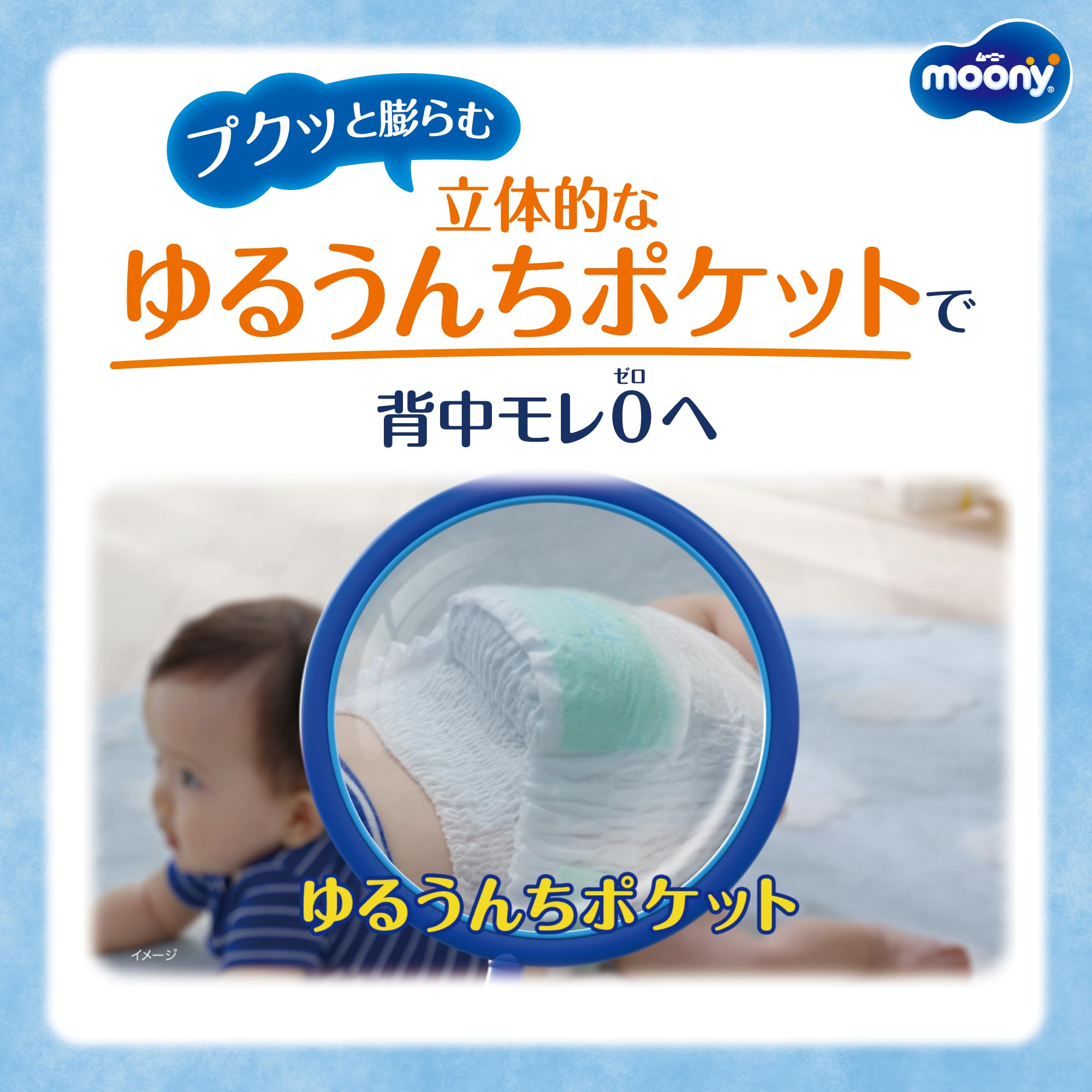 3D設計の「ゆるうんちポケット」で背中モレ0へ! ドドっとうんちもすっぽりキャッチしモレ安心です。また、両脇の「くるっとまとまるテープ」でたっぷりうんちもモレずに、しっかりコンパクトにカンタン後処理できます。さらに、無添加弱酸性トップシートで肌に安心。 ベビーおむつ