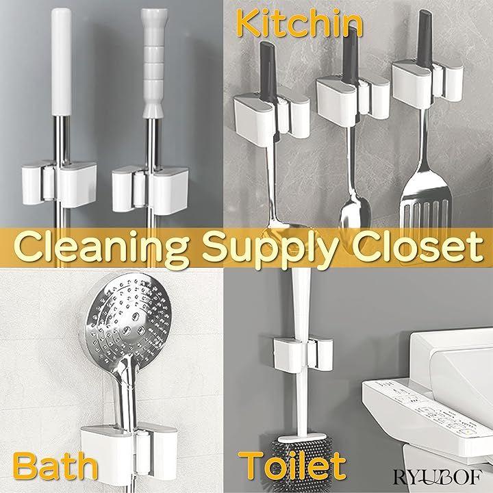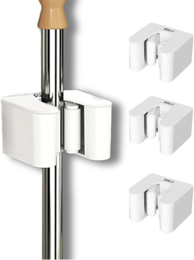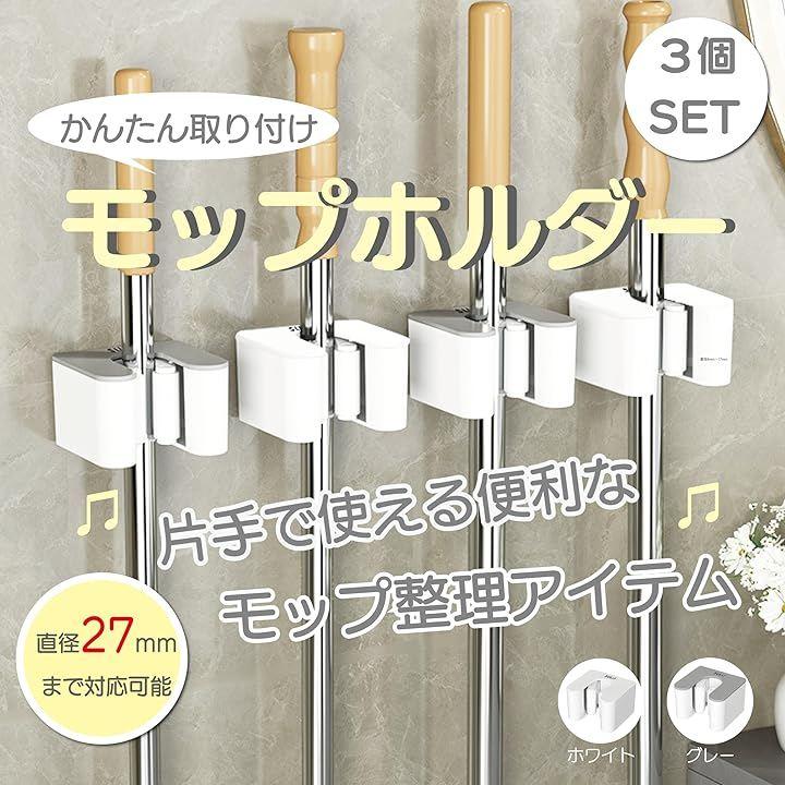 「片手で使える便利なモップ整理アイテム」ワンタッチで簡単にモップやほうき、クイックルワイパーをキャッチ&リリースでき掃除道具の出し入れもスムーズ、散らばりがちな用具も一括整理できます。