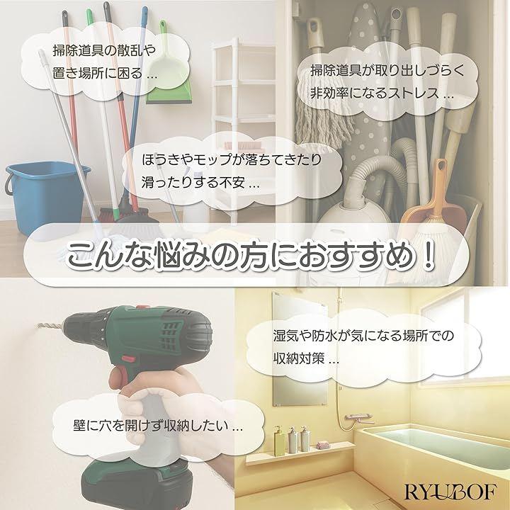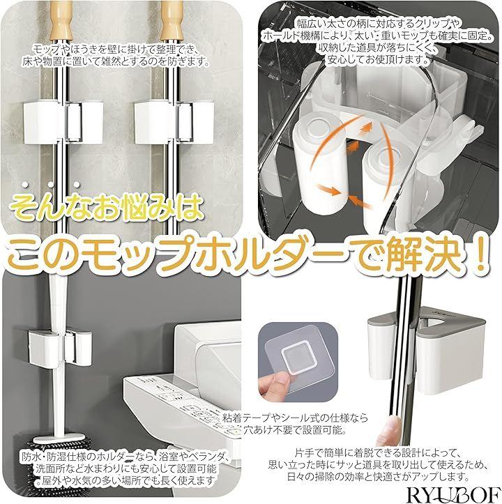 「モップホルダーでスッキリ収納」モップ収納やほうきホルダーとして、浴室やトイレ、ベランダやキッチンなど様々な場所に設置でき、各種掃除道具やクイックルワイパーをしっかり片付けてスペースを有効活用できます。
