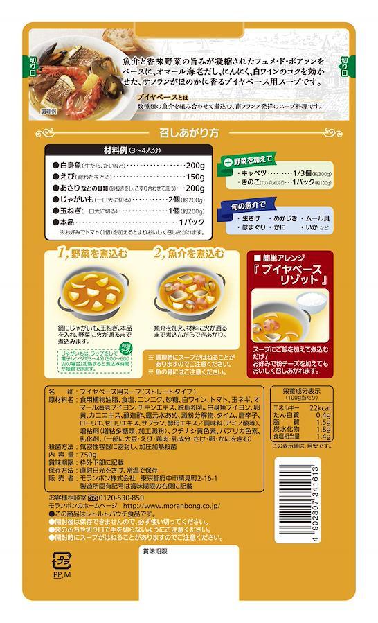 食用植物油脂、食塩、ニンニク、砂糖、白ワイン、トマト、玉ネギ、オマール海老ブイヨン、チキンエキス、脱脂粉乳、白身魚ブイヨン、卵黄、カニエキス、醸造酢、還元水あめ、澱粉分解物、タイム、唐辛子、ローリエ、セロリエキス、サフラン、酵母エキス/調味料(アミノ酸等)、増粘剤(増粘多糖類、加工澱粉)、クチナシ黄色素、パプリカ色素、乳化剤、(一部に大豆・えび・鶏肉・乳成分・さけ・卵・かにを含む)