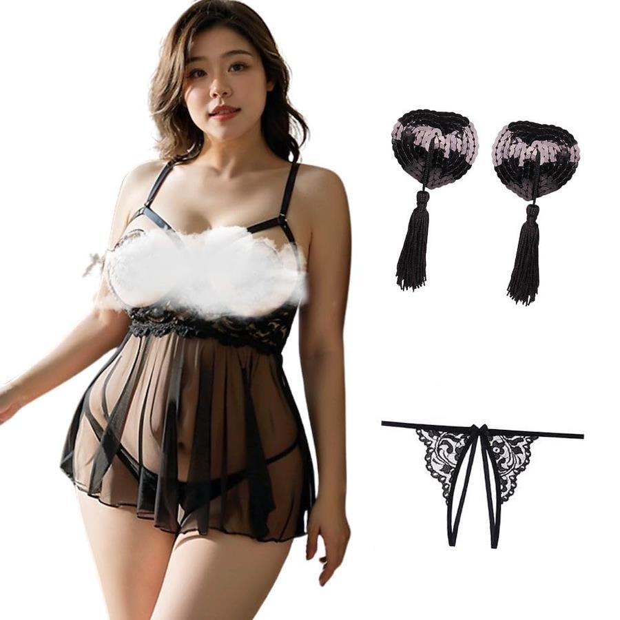原産国 中国??【胸元丸見え×大胆オープンなセクシーランジェリー】 大胆すぎるオープンバスト×クロッチレスTバックの2点セット。視線を奪うセクシーデザインで、着るだけで女性らしさと誘惑があふれ出します。透け感のあるチュールレースがただ過激なだけでなく上品な雰囲気も兼ね備えた特別な一着です。??【こだわりの素材とデザイン】 柔らかく、程よい透け感が魅力のチュールレース生地(ポリエステル+スパンデックス)。軽くて伸縮性に優れ、肌当たりもやさしく快適に楽しめます。ブラのアンダー部分にはワイヤー入りなのでしっかりとバストを支えてくれるのであなたのバストをよりセクシーにみせてくれます。いやらしいニップルシールは動く度に揺れるなまめかしいデザインです。股あきショーツ付きなので興奮冷めやらぬうちにホットなエリアに侵入が可能です♪??【セット内容】:ニップルシール、胸丸出しベビードール ×1 ・股開きTバック ×1 大胆なオープン仕様ながらも、柔らかな素材感で快適な着心地を実現。特別な夜を盛り上げる、実用性と魅力を兼ね備えたセットです。??【ぽっちゃりさんやメンズにうれしい大きいサイズ】 豊満な女性でも安心して着こなせるフリーサイズ(XL~3XL相当)設計。伸縮性のある素材で体型に優しくフィットし、魅力的なボディラインを演出します。 サイズ目安:・ベビードール着丈:約56cm(肩紐含まず)・アンダーバスト:平置き約35cm ・Tバックウエスト:72~120cm ・推奨体重:60~80kg??【おすすめの着用シーン】 バレンタイン、誕生日、記念日、クリスマス、ハロウィン、カップルの特別な夜に。大胆だけど美しい――そんな理想の演出を叶えてくれる一着です。自分へのご褒美にも、サプライズギフトにもおすすめ。(#lf)(#lf)(#lf)商品購入前に、ストア紹介ページをご確認ください。