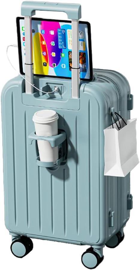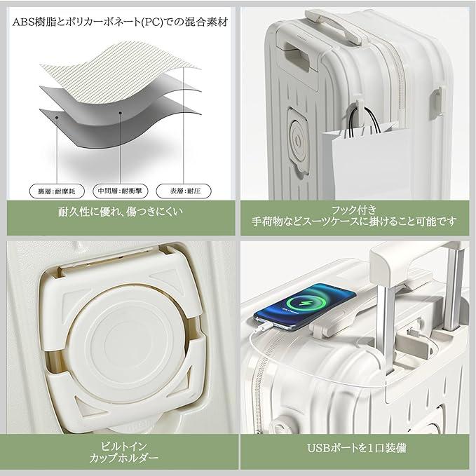 ■商品説明?「令和5年7月最新型」とにかく使いやすい、USBポートとカップホルダーを搭載してスーツケースを開けることなくスマホを充電できます。飛行機内にスーツケースを持ち込むサイズで日帰りや1-2泊などの小旅行や出張であれば十分です。「ABS+PC」ABS樹脂とポリカーボネートでの混合素材を採用し、軽量かつ頑丈で耐衝撃性を実現しています。機内持ち込みときにほかの人に乱暴に扱われ破損する恐れがないです。「静 音」静音ダブルキャスターが搭載されている、気兼ねなく持ち歩けるのも魅力です。360°回転に対応しているため、小回りが利き。人混みのなかや狭い道を通るときでも、自分の体にピッタリとくっ付けてスムーズに移動できるのが魅力です。「収納スペース」スーツケース内は前後両方のシェルに「X字バンド」を搭載。前側のシェルにはメッシュポケット付きの中仕切りを備えており、小物を整理して収納できます。キャリーハンドルは長さの調節が可能。身長や使用するシーンに合わせて長さを変更できる。「ファスナータイプ」:開閉部分が布製で軽量なのがメリット。ファスナーが衝撃を吸収するので、比較的壊れにくいのもポイントです。少しだけ開けて荷物を出し入れできる手軽さも兼ね備えています。