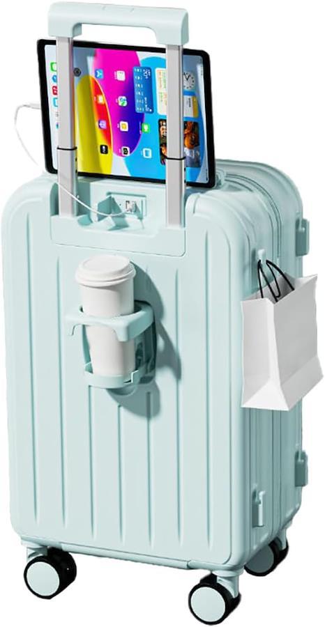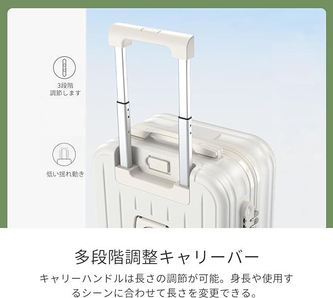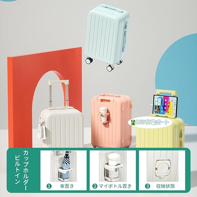 ■商品説明?「令和5年7月最新型」とにかく使いやすい、USBポートとカップホルダーを搭載してスーツケースを開けることなくスマホを充電できます。飛行機内にスーツケースを持ち込むサイズで日帰りや1-2泊などの小旅行や出張であれば十分です。「ABS+PC」ABS樹脂とポリカーボネートでの混合素材を採用し、軽量かつ頑丈で耐衝撃性を実現しています。機内持ち込みときにほかの人に乱暴に扱われ破損する恐れがないです。「静 音」静音ダブルキャスターが搭載されている、気兼ねなく持ち歩けるのも魅力です。360°回転に対応しているため、小回りが利き。人混みのなかや狭い道を通るときでも、自分の体にピッタリとくっ付けてスムーズに移動できるのが魅力です。「収納スペース」スーツケース内は前後両方のシェルに「X字バンド」を搭載。前側のシェルにはメッシュポケット付きの中仕切りを備えており、小物を整理して収納できます。キャリーハンドルは長さの調節が可能。身長や使用するシーンに合わせて長さを変更できる。「ファスナータイプ」:開閉部分が布製で軽量なのがメリット。ファスナーが衝撃を吸収するので、比較的壊れにくいのもポイントです。少しだけ開けて荷物を出し入れできる手軽さも兼ね備えています。
