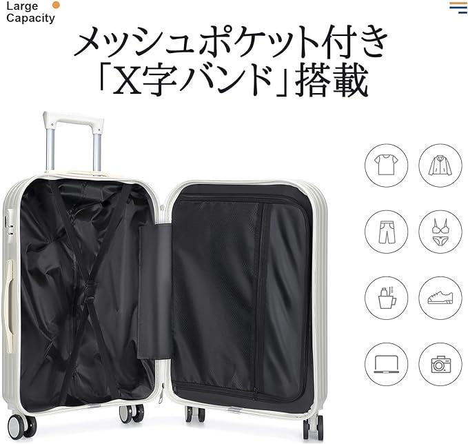 「令和5年7月最新型」とにかく使いやすい、USBポートとカップホルダーを搭載してスーツケースを開けることなくスマホを充電できます。飛行機内にスーツケースを持ち込むサイズで日帰りや1-2泊などの小旅行や出張であれば十分です。 「ABS+PC」ABS樹脂とポリカーボネートでの混合素材を採用し、軽量かつ頑丈で耐衝撃性を実現しています。機内持ち込みときにほかの人に乱暴に扱われ破損する恐れがないです。 「静 音」静音ダブルキャスターが搭載されている、気兼ねなく持ち歩けるのも魅力です。360°回転に対応しているため、小回りが利き。人混みのなかや狭い道を通るときでも、自分の体にピッタリとくっ付けてスムーズに移動できるのが魅力です。 「収納スペース」スーツケース内は前後両方のシェルに「X字バンド」を搭載。前側のシェルにはメッシュポケット付きの中仕切りを備えており、小物を整理して収納できます。キャリーハンドルは長さの調節が可能。身長や使用するシーンに合わせて長さを変更できる。 「ファスナータイプ」:開閉部分が布製で軽量なのがメリット。ファスナーが衝撃を吸収するので、比較的壊れにくいのもポイントです。少しだけ開けて荷物を出し入れできる手軽さも兼ね備えています。