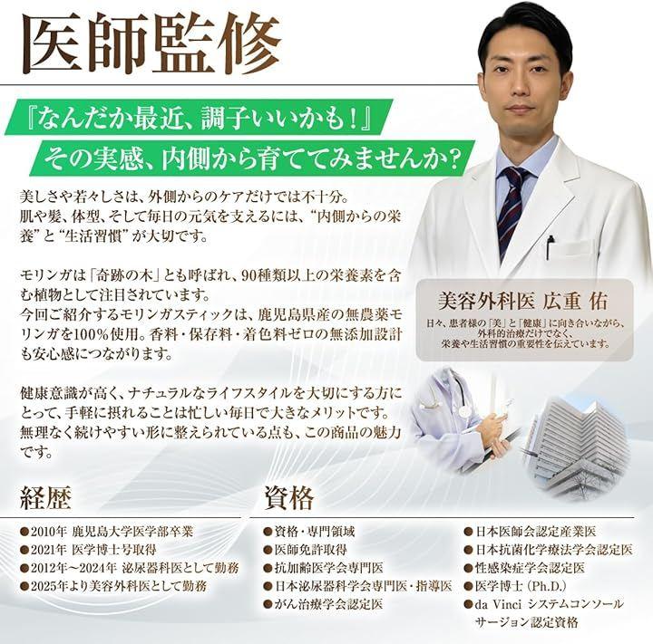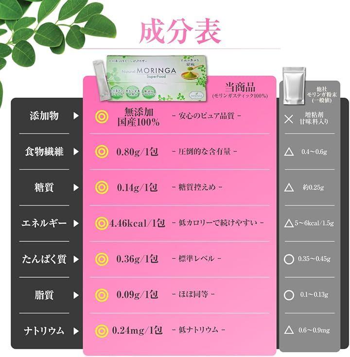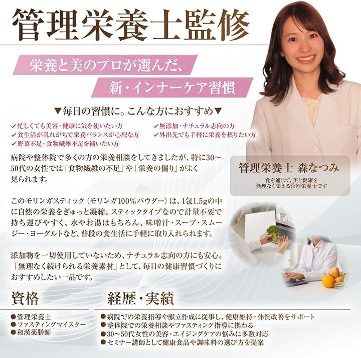 内容量:1.5g x 40本 原材料:鹿児島県産 モリンガ100% 形状:スティック分包タイプ 監修:医師・管理栄養士