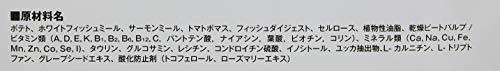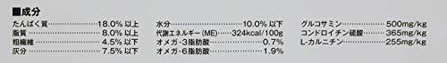 たんぱく質:18.0%以上、脂質:8.0%以上、粗繊維:4.5%以下、灰分:7.5%以下、水分:10.0%以下、代謝エネルギー(ME):324kcal/100g、オメガ-3脂肪酸:0.7%、オメガ-6脂肪酸:1.9%、グルコサミン:500mg/kg、コンドロイチン硫酸:365mg/kg、L-カルニチン:255mg/kg