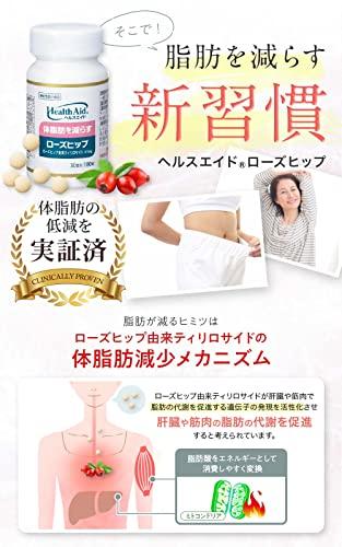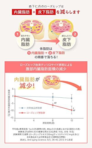 【お腹周りの体脂肪が気になる方に】森下仁丹が用途特許を取得したローズヒップ由来のティリロサイドを含有したサプリ 【森下仁丹の独自成分】ローズヒップはハーブティでおなじみのビタミンCを多く含有している素材ですが、森下仁丹が長年の研究の結果、ローズヒップに含まれる「ティリロサイド」に体脂肪を減らす効果があることを発見しました。 【体脂肪を減らす新習慣】1日6粒!続けやすく持ち運びしやすい粒タイプです。 【機能性表示食品】届出番号:A16【機能性関与成分】ローズヒップ由来ティリロサイド 0.1mg 【届出表示】本品にはローズヒップ由来ティリロサイドが含まれるので、体脂肪を減らす機能があります。 【内容量】30日分(180粒)【栄養成分表示】6粒(1.98g)当たり エネルギー3.0kcal、たんぱく質0.15g、脂質0.032?0.12g、炭水化物1.6g、食塩相当量0.0013g L-カルニチン200mg、生姜粉末100mg、マンゴージンジャーエキス末100mg