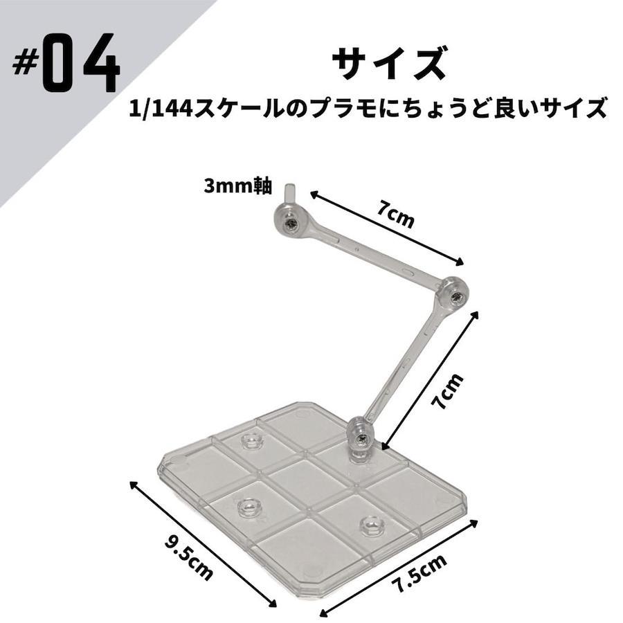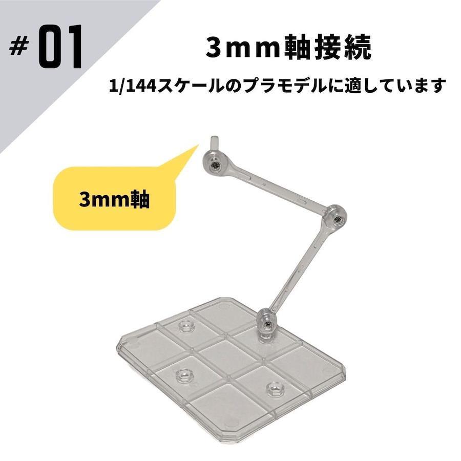 シンプルな透明クリアカラー 汎用 ディスプレイスタンド。プラモデルや模型、フィギュアなどが転倒しないように支える為のスタンドです。様々なアクションポーズが決まります。 3㎜軸なのでバンダイのHG、RG 1/144スケールのガンプラに互換性があります。 ※本製品は汎用品です。プラモデルの種類によっては取り付けできない場合があります。また、3mm軸のサイズは、ロットや製造工程により若干の誤差が生じる可能性があります。 C型クリップ付属。3mm軸に対応していないフィギュアや食玩、ドールなど様々な人型のプラモデルも対応可能です。 アームの関節は3箇所あり、自由自在にフレキシブルに動かすことが可能です。関節部はビス固定なので重たい模型もOK。ビス部分は組み立て済みなのでドライバー準備不要です。 ベース部分にはアームを差し込む穴が4つ空いています。アームを最大4つ接続できるので、プラモデルをまとめて飾ることも可能です。
