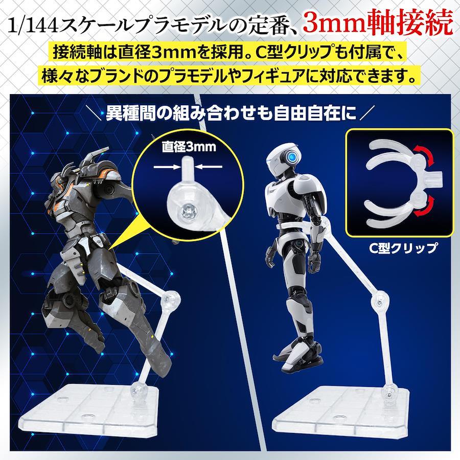 シンプルな透明クリアカラー 汎用 ディスプレイスタンド。プラモデルや模型、フィギュアなどが転倒しないように支える為のスタンドです。様々なアクションポーズが決まります。 3㎜軸なのでバンダイのHG、RG 1/144スケールのガンプラに互換性があります。 ※本製品は汎用品です。プラモデルの種類によっては取り付けできない場合があります。また、3mm軸のサイズは、ロットや製造工程により若干の誤差が生じる可能性があります。 C型クリップ付属。3mm軸に対応していないフィギュアや食玩、ドールなど様々な人型のプラモデルも対応可能です。 アームの関節は3箇所あり、自由自在にフレキシブルに動かすことが可能です。関節部はビス固定なので重たい模型もOK。ビス部分は組み立て済みなのでドライバー準備不要です。 ベース部分にはアームを差し込む穴が4つ空いています。アームを最大4つ接続できるので、プラモデルをまとめて飾ることも可能です。