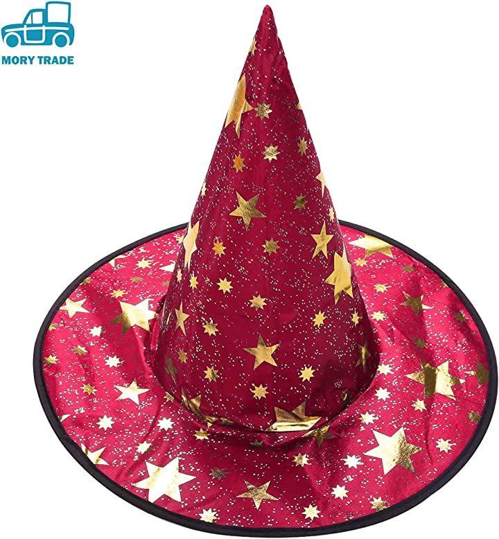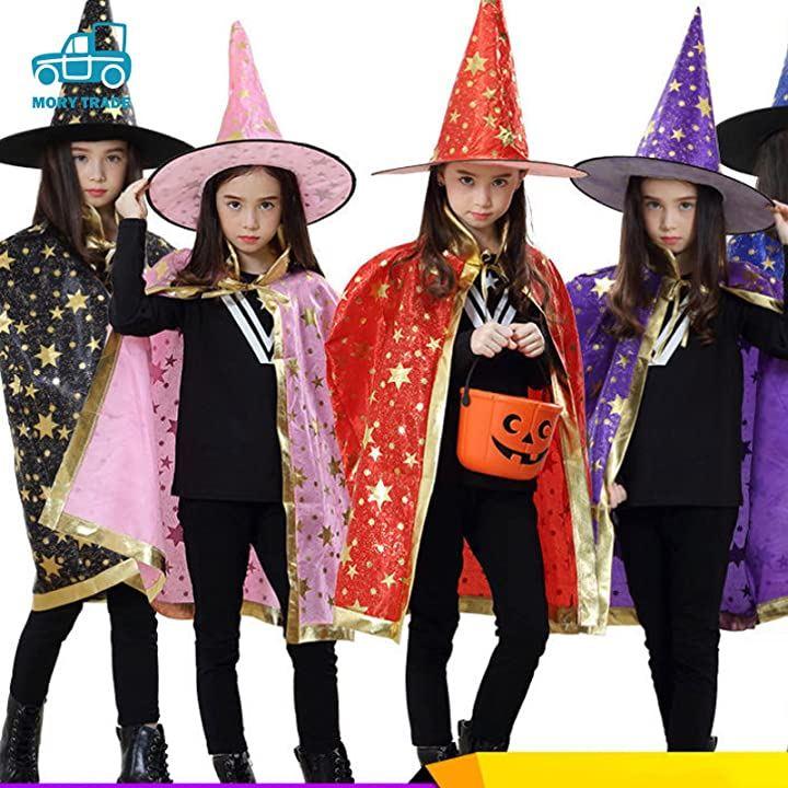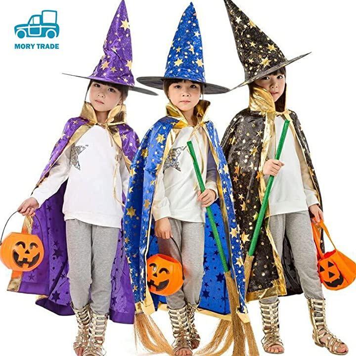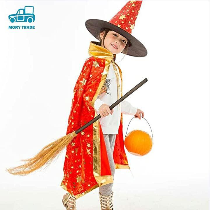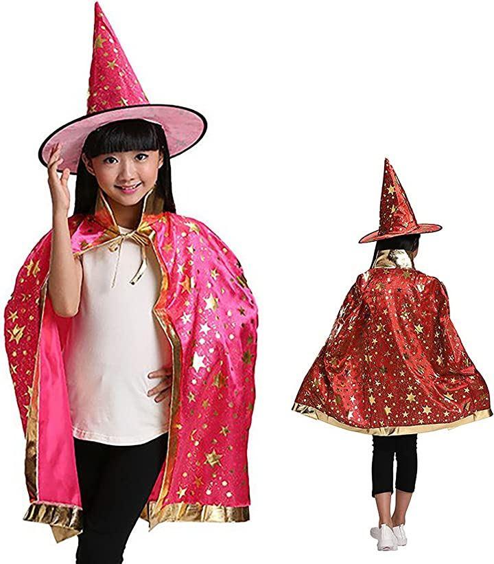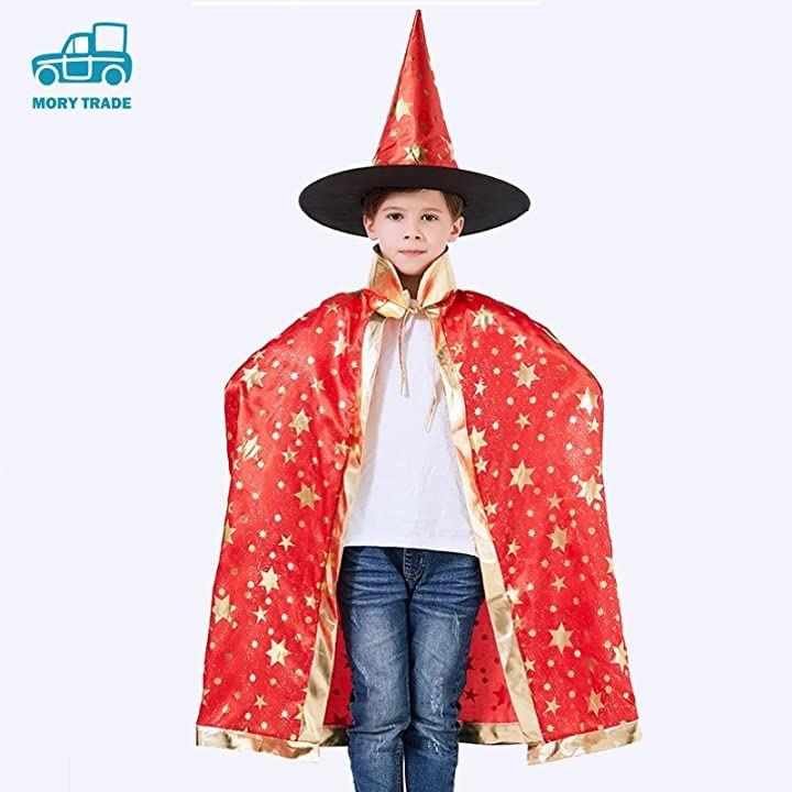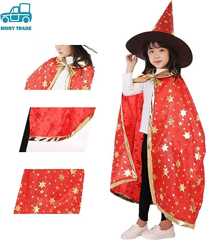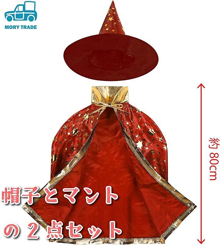 キラキラ金色のデザインが可愛い、マントと、三角とんがり帽子のセットです。