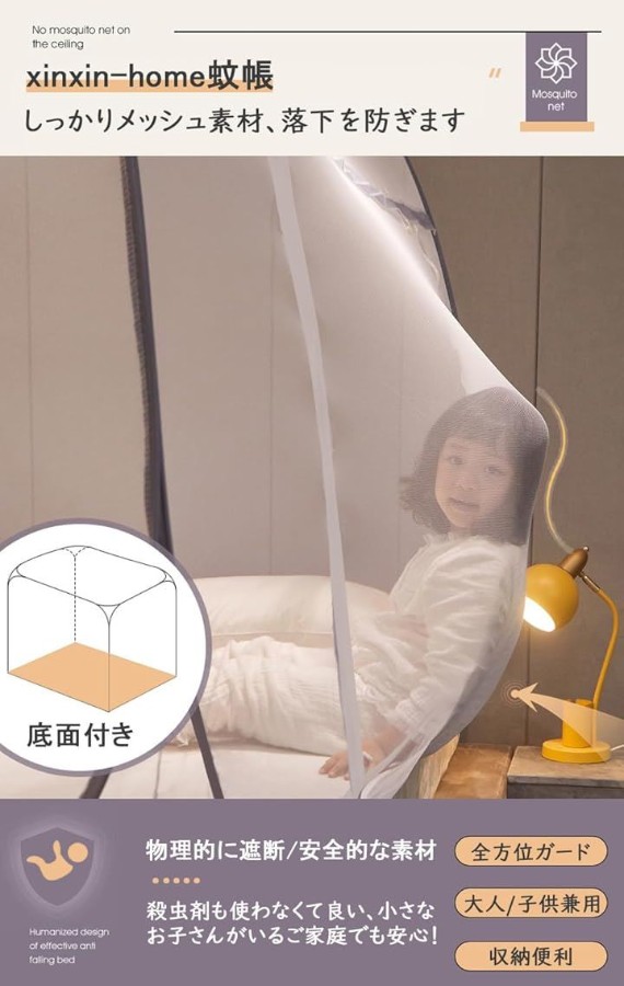 テント式で底までネットをしっかり張れるので、科学製品でなんか不安でしょう、これで物理的に遮断してぐっすり眠れそうで安心、しかも安全。