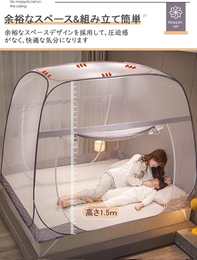 テント式で底までネットをしっかり張れるので、科学製品でなんか不安でしょう、これで物理的に遮断してぐっすり眠れそうで安心、しかも安全。