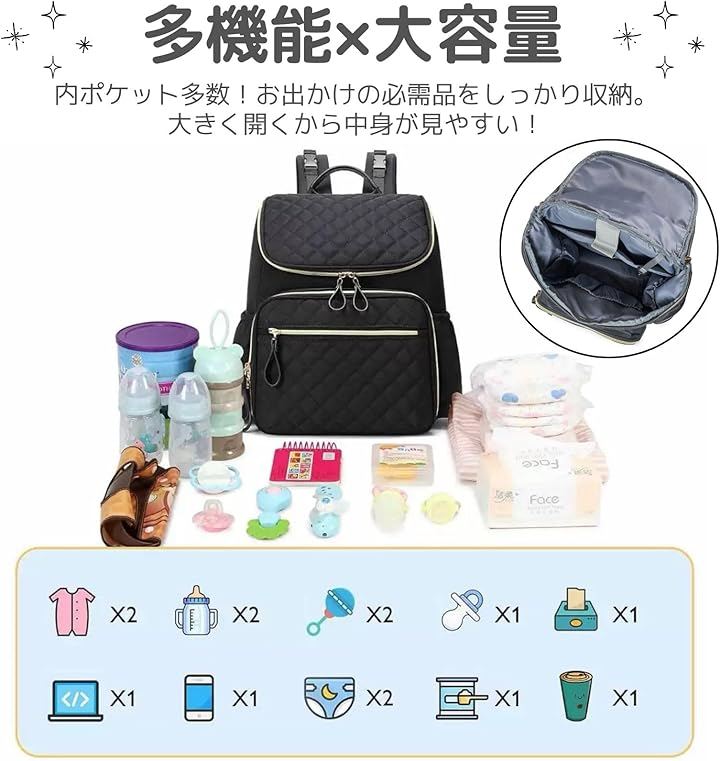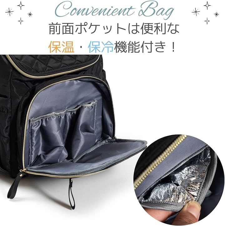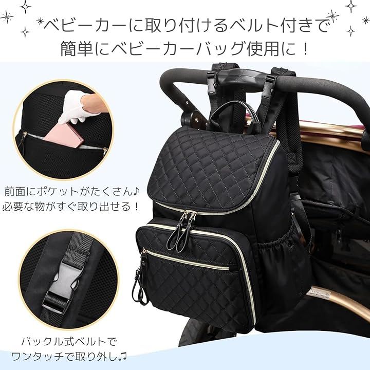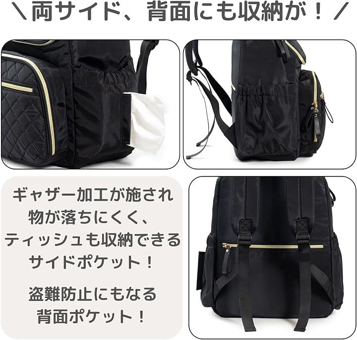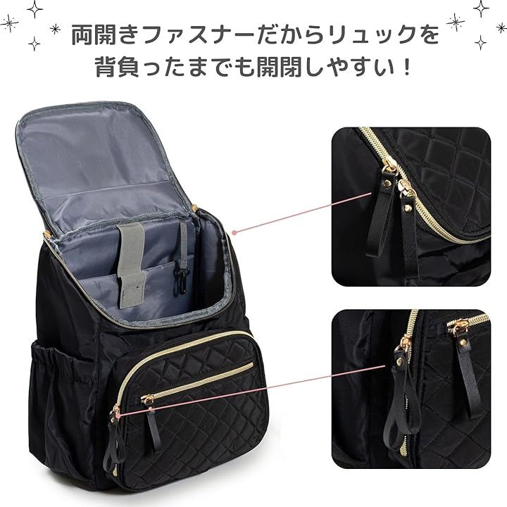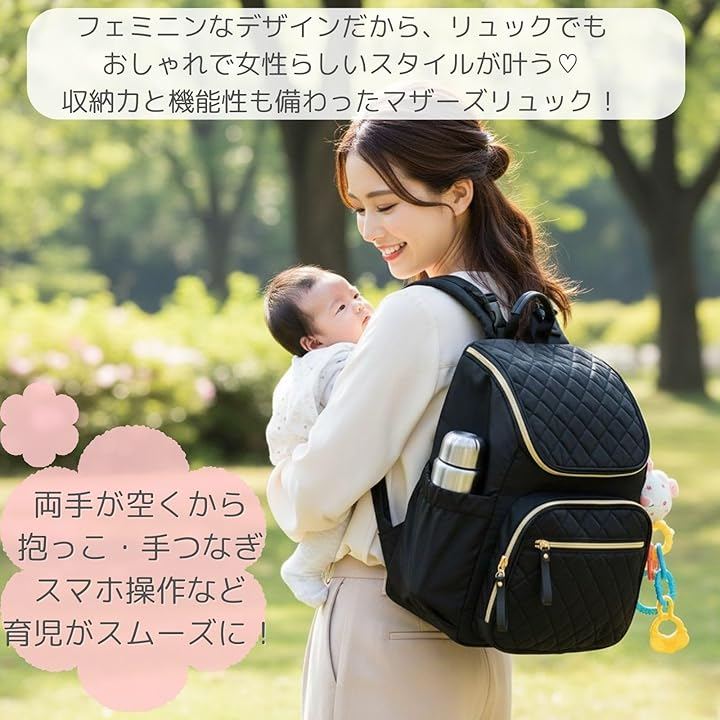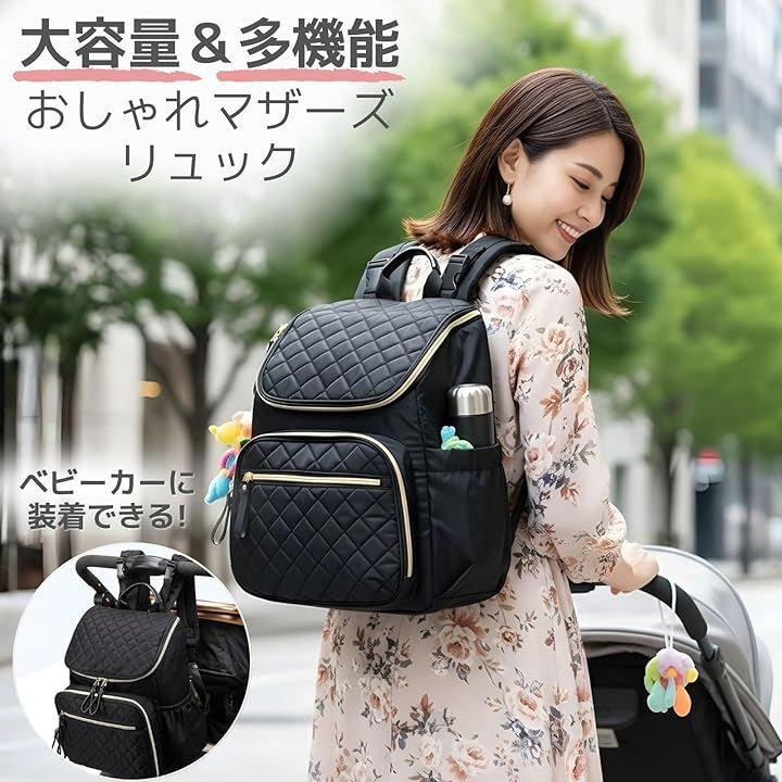 「品格漂う上品デザイン」 カジュアルになりがちなマザーズリュックを、高級感のあるキルティング加工とゴールドのファスナーで仕上げました。