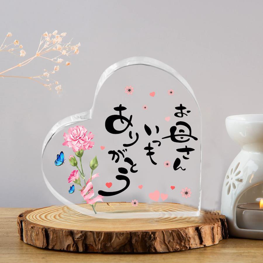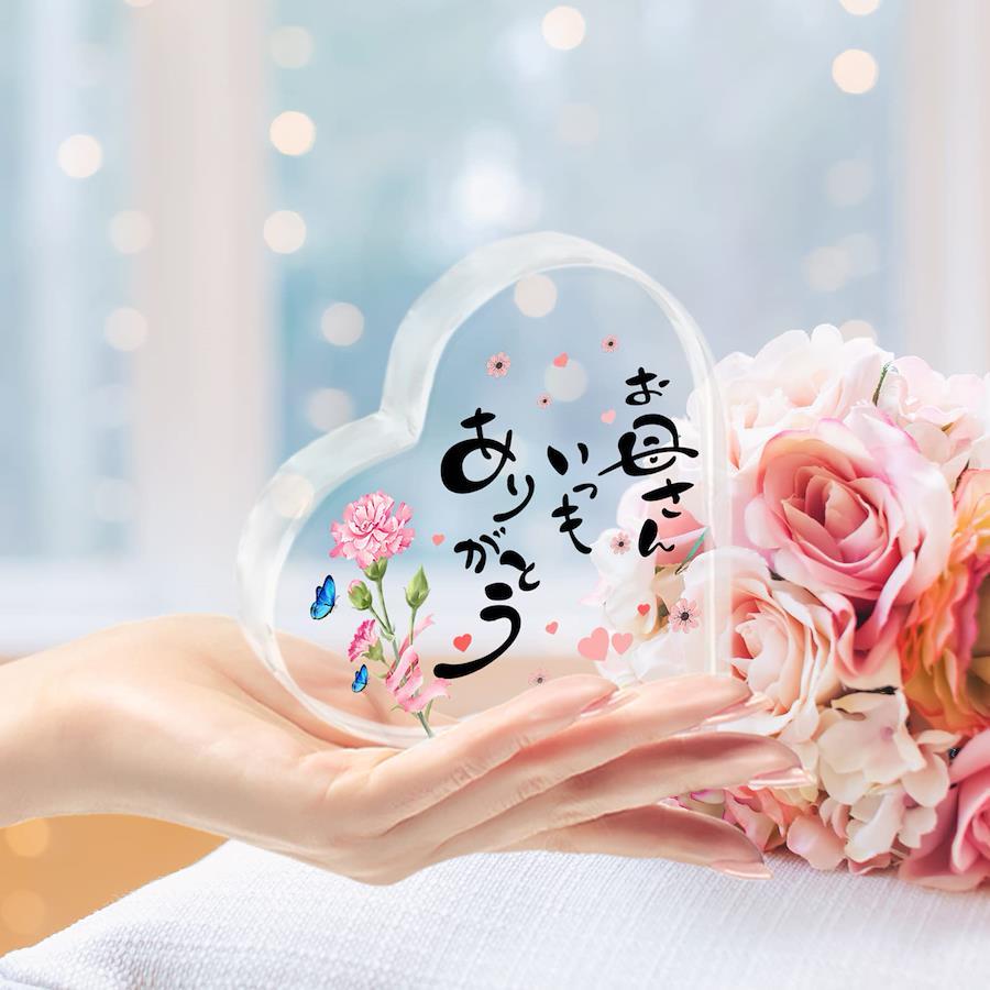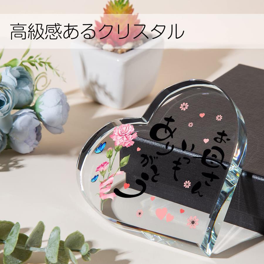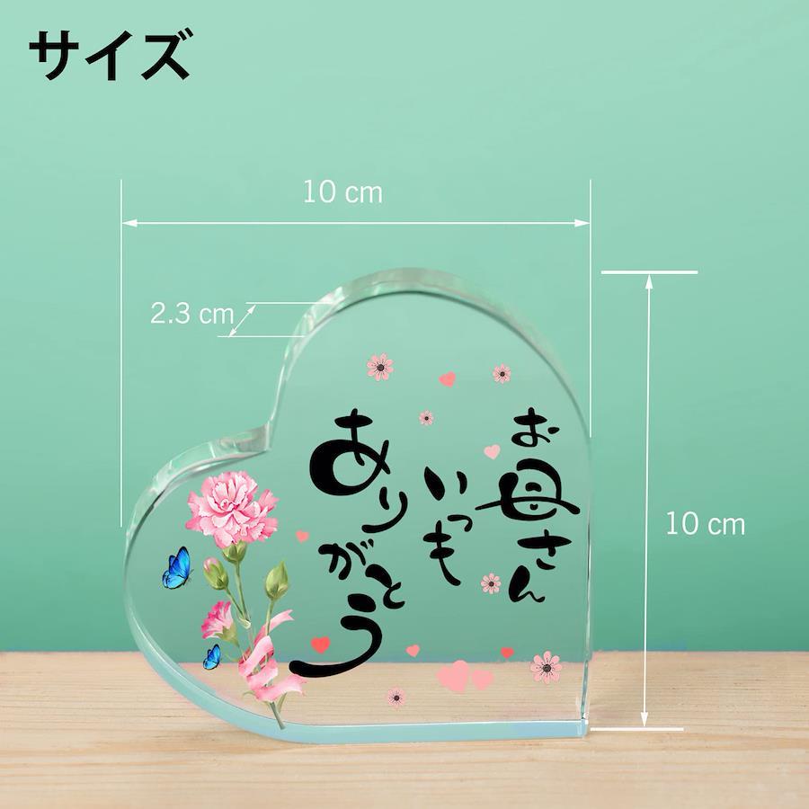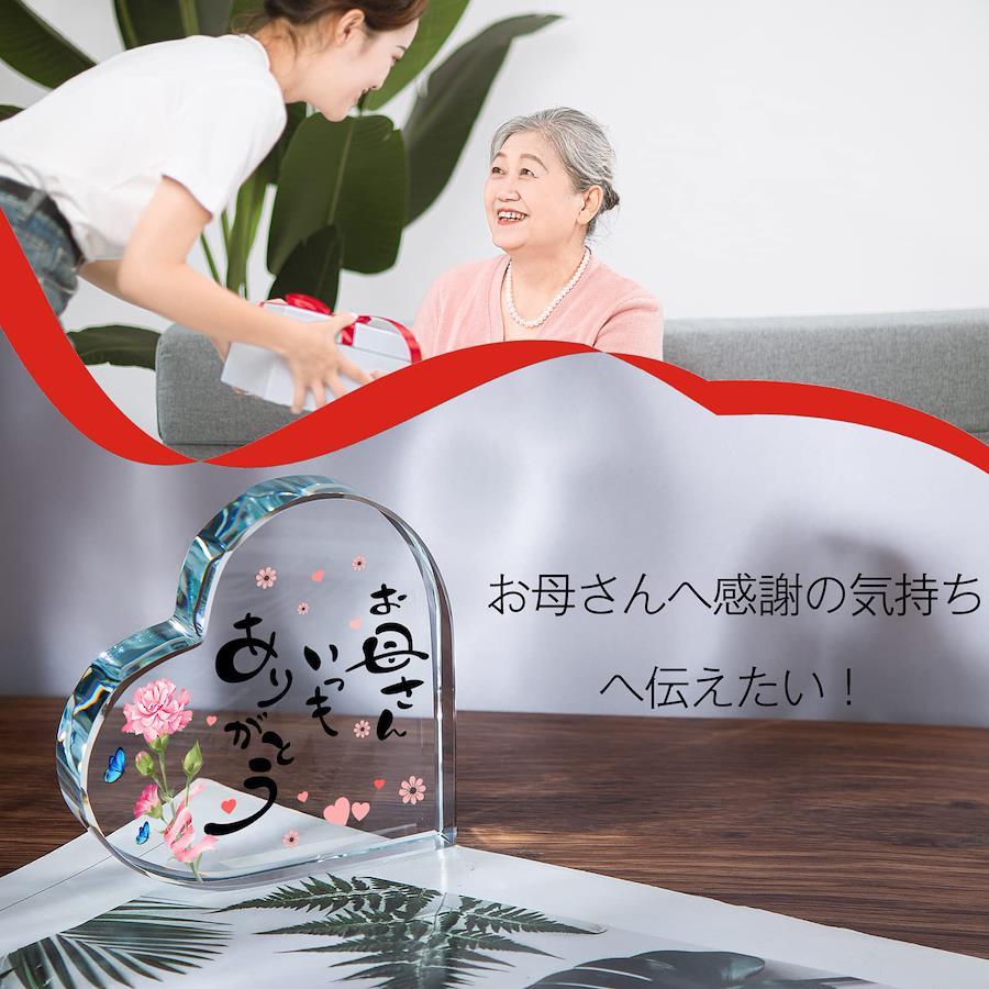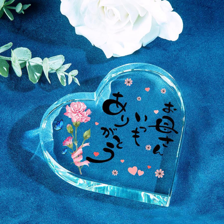 クリスタル製:透明度が高いクリスタルで作られまして、高級感があります。サイズ:約10 x 10 x 2.3 cm。厚手ガラスの記念楯「お母さんありがとう感謝の楯」です。デザイン:文字と花柄はハート形のガラスの表面に印刷します。ありがとうの気持ちをカーネーションやほんわか模様が温かみを表し感謝の気持ちをより演出してくれそうです。母へのギフト:「お母さんいつもありがとう」の文字に日頃の感謝の気持ちを込めて、お母さんへ心のこもった贈り物で、一生の記念に残る特別なプレゼントです。母の日プレゼント、誕生日、退職や記念日にお使いいただけます。インテリア:場所を選ばず置きやすいサイズなので、ホーム、寝室、オフィス、リビング、ダイニング、寝室、台所、トイレ、玄、などのお気に入りのところでいいインテリアとして楽しめます。お母さんへ感謝の気持ち伝わります。【免責事項】メーカーによる商品リニューアルに伴いパッケージが変更が行われた場合、新パッケージでお届け致します事ご了承願います。